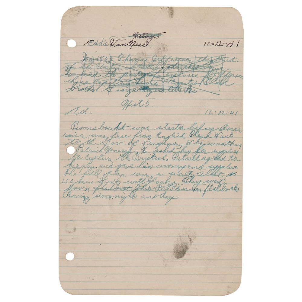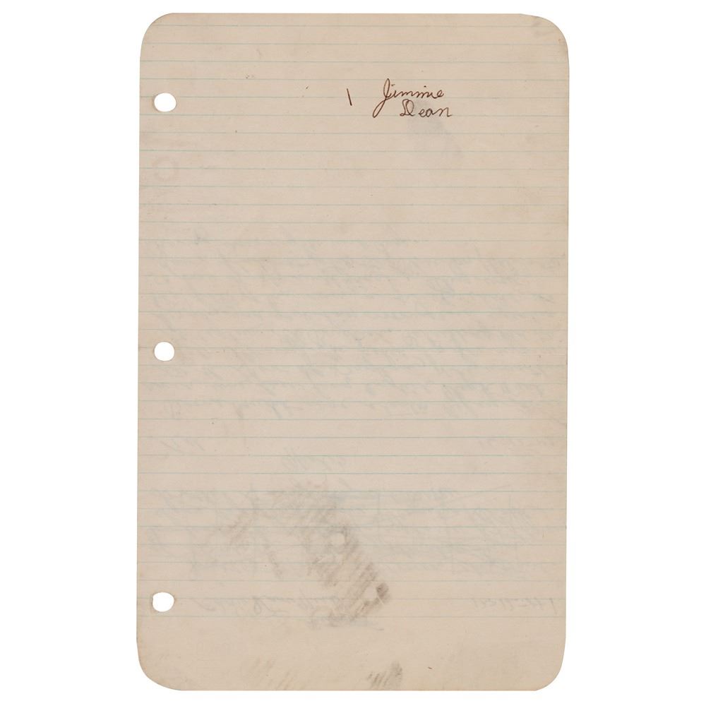 Extremely early ink signature, "Jimmie Dean,” on an off-white 6 x 9.5 sheet of notebook paper, the reverse of which features a handwritten work assignment by his 5th grade classmate Eddie Van Ness, who dates his work to December 12, 1941, which places James Dean at the age of 10 when he made this autograph. In fine condition.