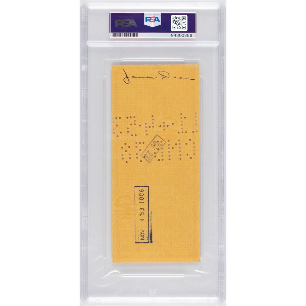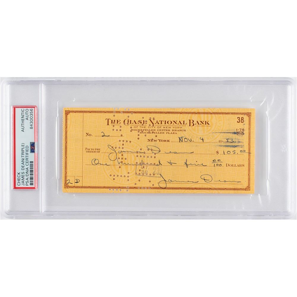 The Chase National Bank check, 6.25 x 2.75, neatly filled out and signed by Dean, "James Dean," payable to himself, "James Dean," for $105, November 4, 1953. Endorsed on the reverse in black ink, "James Dean." In fine condition. Encapsulated in a PSA/DNA authentication holder.