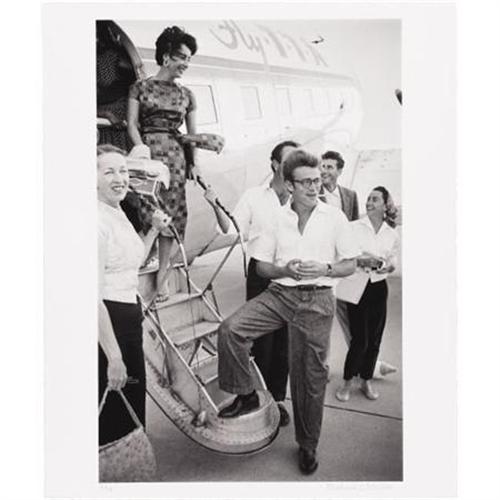 <B>James Dean and Elizabeth Taylor Photo by Richard C. Miller.</B></I> A b&w 20" x 24" photo of Dean and Taylor debarking from a plane, around the time they were filming <I>Giant</B></I> in 1955, taken by photographer Richard C. Miller. An aspiring actor as a young man, Miller gave up the stage to pursue a career in photography; he was shooting location coverage on <I>Giant</B></I> when he took this photo. The print is #2 in a limited edition of 24 and is signed by Miller in pencil near the bottom right corner. In Excellent condition with textured edges.<BR><BR><b>Shipping:</b> Flat Material, Large (<a target="_blank" href="http://www.heritageauctions.com/common/shipping.php">view shipping information</a>)