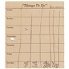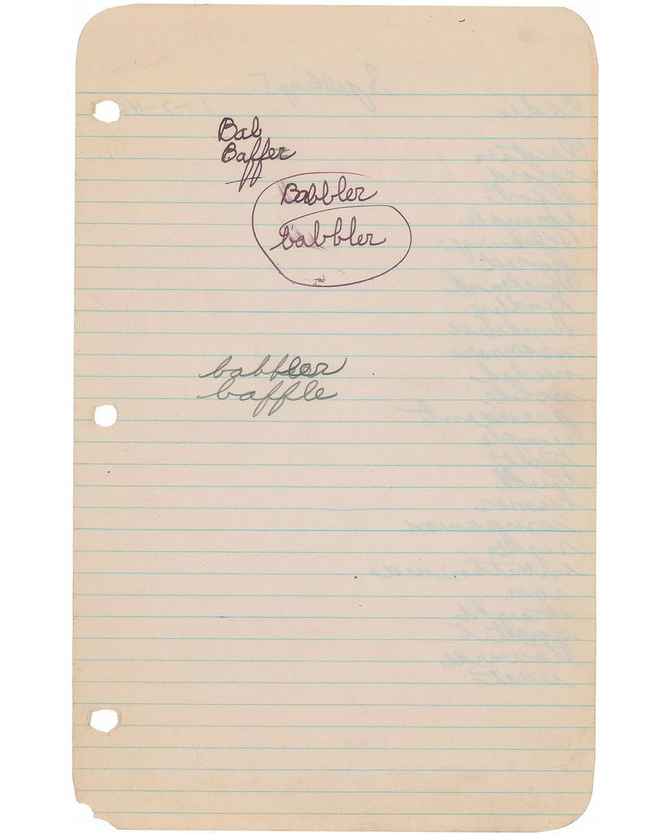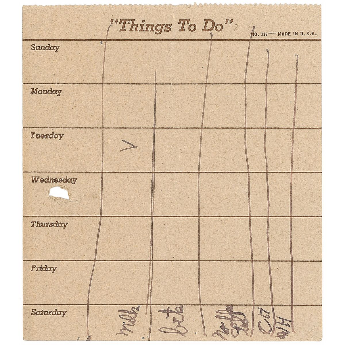 The remaining three pages are less substantial: on one, Dean outlined a similar chart listing the days of the week, but did not fill it out; the reverse bears another student's schoolwork about Lewis and Clark. On another, Dean has written in ink “Bab / Baffer / Babbler / babbler,” and in pencil, “babbler / baffle"; another spelling test in the hand of Eddie Van Ness is on the reverse of this sheet. The final page is a smaller printed weekly to-do list on which Dean drew vertical lines to create a chart, filling out one row in ink with “Milk,” “Bcts,” “No coffee tea,” “CH,” and “WH.”