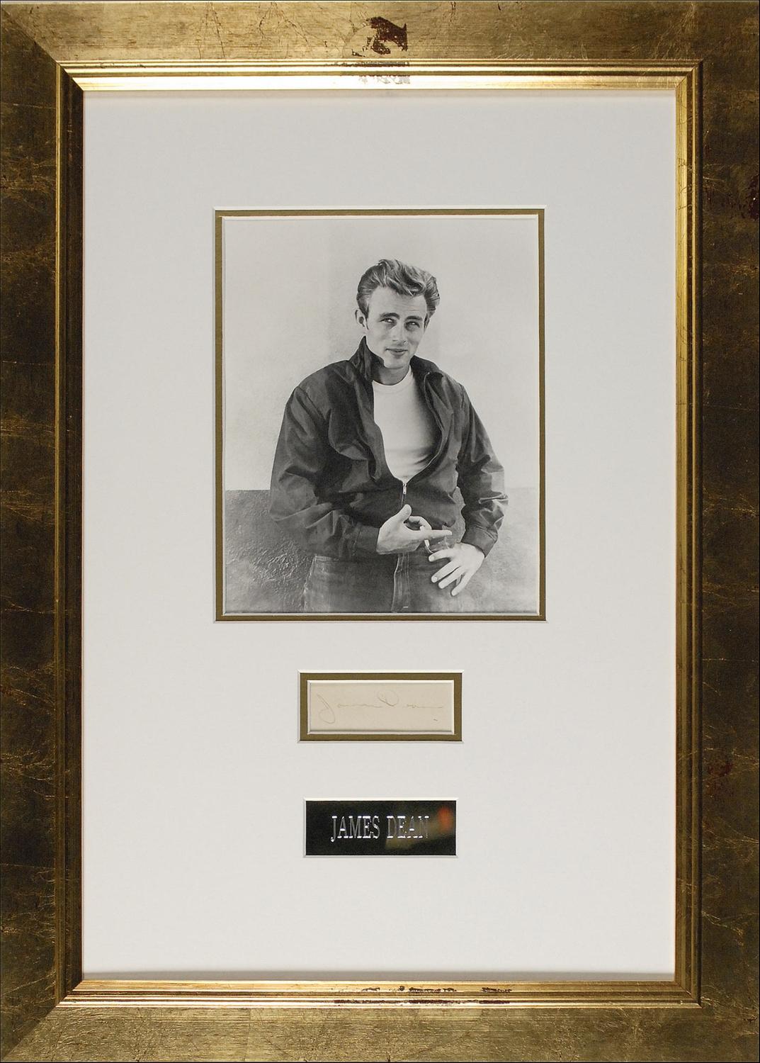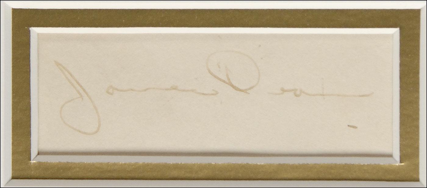 American actor (1931–1955) best known for his star turns in three 1950s screen classics: East of Eden, Rebel Without a Cause, and Giant. His untimely death in a high-speed car crash elevated him to the status of Hollywood legend. Vintage fountain pen signature, “James Dean,” on an off-white album page. Double matted and framed (without glass) with a classic photo of Dean in his leather jacket and a small name plaque, to an overall size of 17 x 23.25. In fine condition, with a uniform shade of mild toning to page and Dean’s signature a shade or two light, but completely legible.