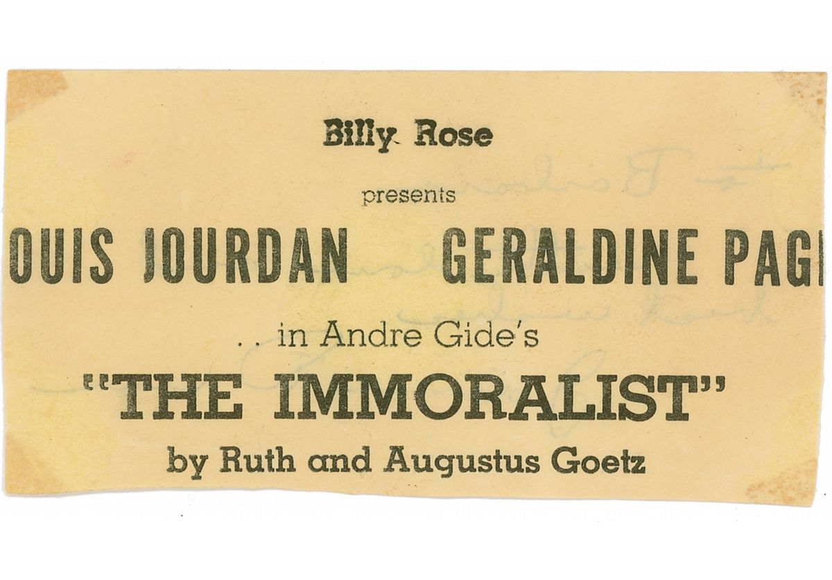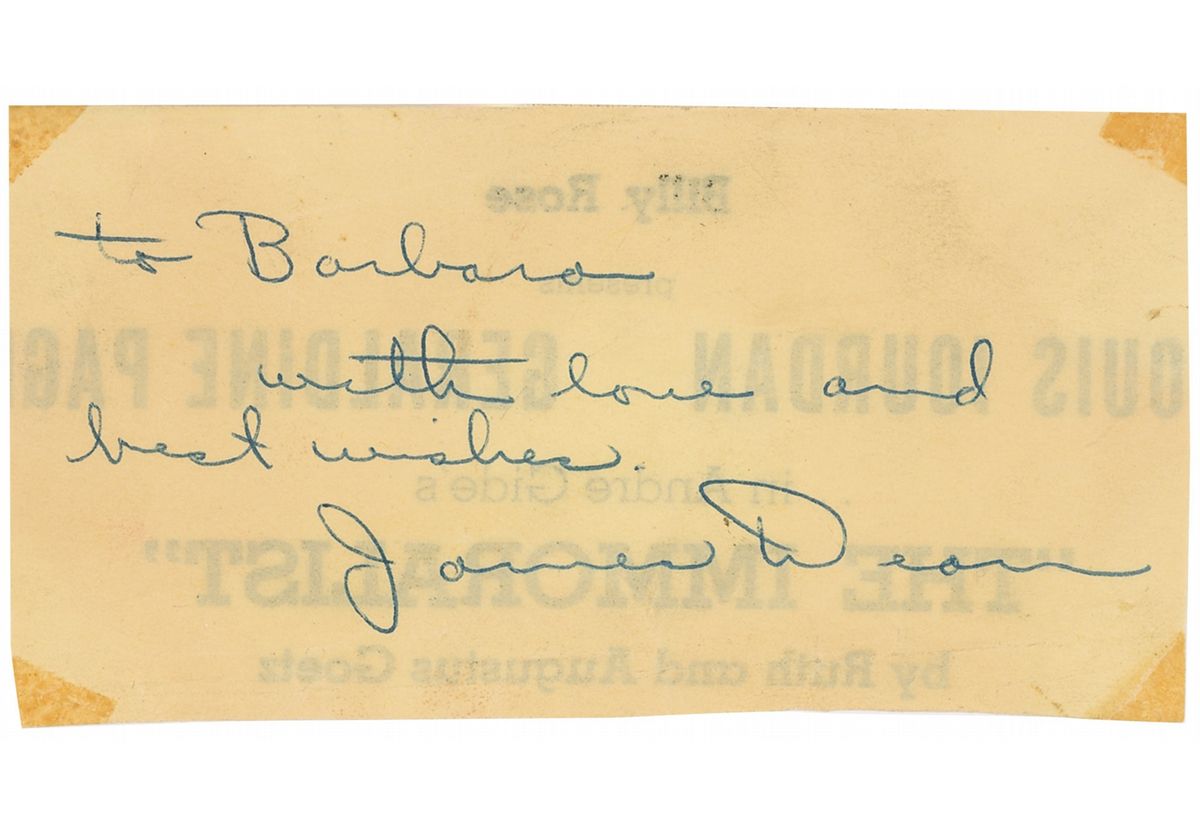 American actor (1931–1955) best known for his star turns in three 1950s screen classics: East of Eden, Rebel Without a Cause, and Giant. His untimely death in a high-speed car crash elevated him to the status of Hollywood legend. Very rare and highly coveted vintage ballpoint signature and inscription, “to Barbara, with love and best wishes, James Dean,” on the reverse of a light yellow 4.5 x 2.25 slip clipped from the cast page of a program from Dean’s first Broadway play, The Immoralist. In fine condition, with light toning from mounting remnants to each corner tip and mild show-through from printing on reverse. Positive reviews from Dean’s 1954 performance as Bachir in The Immoralist, led to calls from Hollywood and Dean’s iconic roles in East of Eden and Rebel Without a Cause.