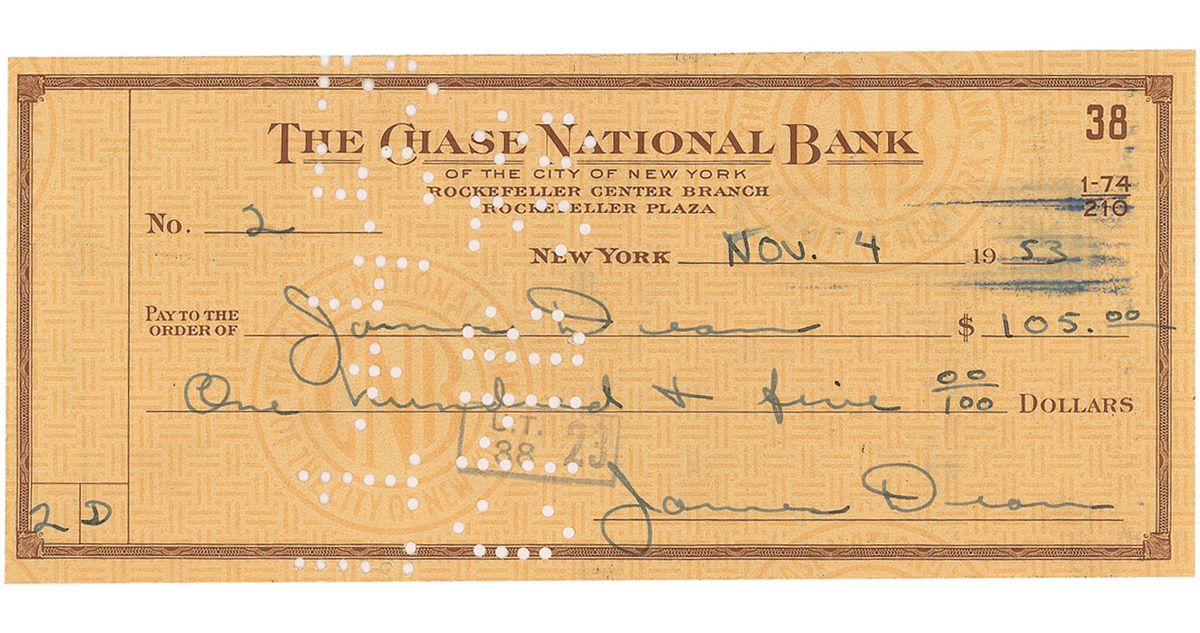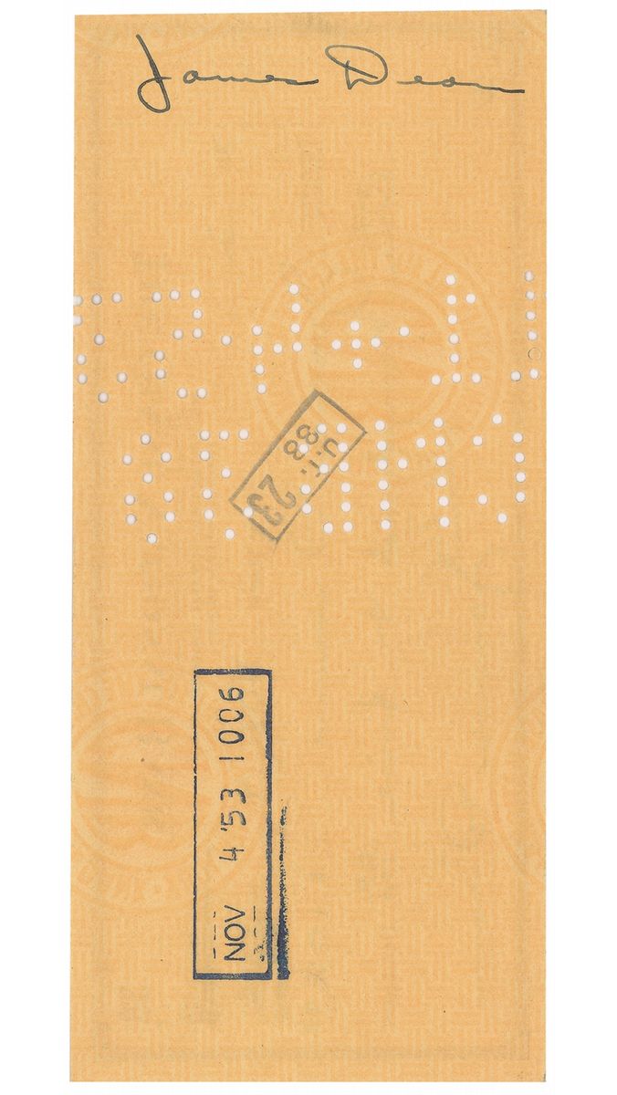 American actor (1931–1955) best known for his star turns in three 1950s screen classics: East of Eden, Rebel Without a Cause, and Giant. His untimely death in a high-speed car crash came to represent the very embodiment of the ‘live fast, die young’ philosophy—and elevated him to the status of a legend that remains unique in the annals of Hollywood. Rare and highly desirable bank check, 6.25 x 2.75, filled out, signed, and endorsed by Dean, payable to James Dean for $105.00, November 4, 1953, and endorsed on the reverse “James Dean.” Cancellation holes to body, a bank stamp next to signature, and light show-through from a bank stamp on reverse, otherwise fine condition. The year of 1953 proved to be quite successful for Dean, as he appeared in fourteen different roles, including November television performances in the role of ‘Joey’ in Armstrong Circle Theater’s The Bells of Cockaigne and as ‘Paul’ in the television film Harvest. In early 1954, Dean headed for Los Angeles to begin shooting East of Eden, the role that would garner him the first posthumous acting nomination in the history of the Academy Awards. Triple-signed checks from Dean are very highly sought after by collectors.