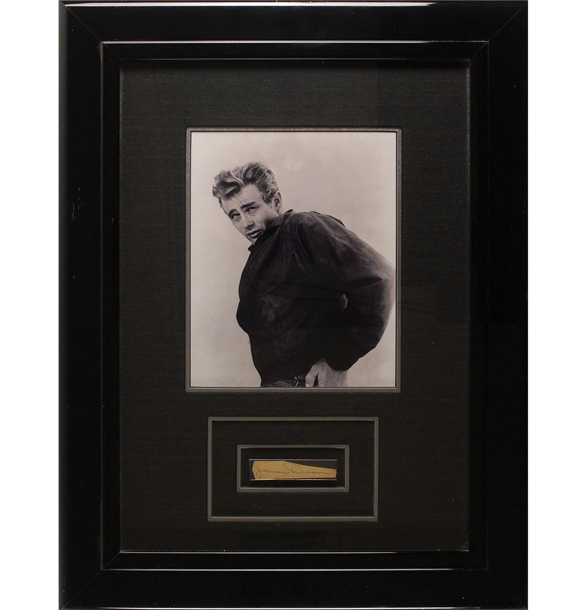 Vintage ink signature, “James Dean,” on an off-white 3 x 1.5 irregularly clipped slip, affixed to a slightly larger black slip. Beautifully double-cloth-matted and framed with a portrait of Dean to an overall size of 16.5 x 21.5. Light overall toning and soiling, otherwise fine condition. Accompanied by a letter of authenticity from PSA/DNA.