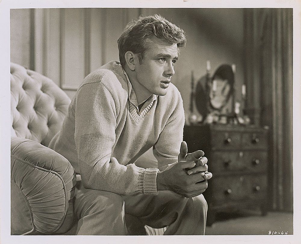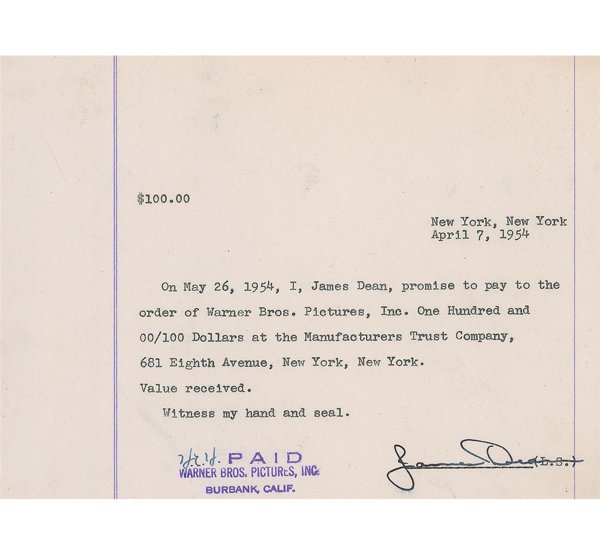 DS, one page, 8 x 6, April 7, 1954. Promissory note between Dean and Warner Bros. In part: “On May 26, 1954, I, James Dean, promise to pay to the order of Warner Bros. Pictures, Inc. One Hundred and 00/100 Dollars.” In fine condition, with a barely noticeable tack hole to the upper portion repaired with tape to the reverse (far from any text). Accompanied by an unsigned glossy photo of Dean in East of Eden.
