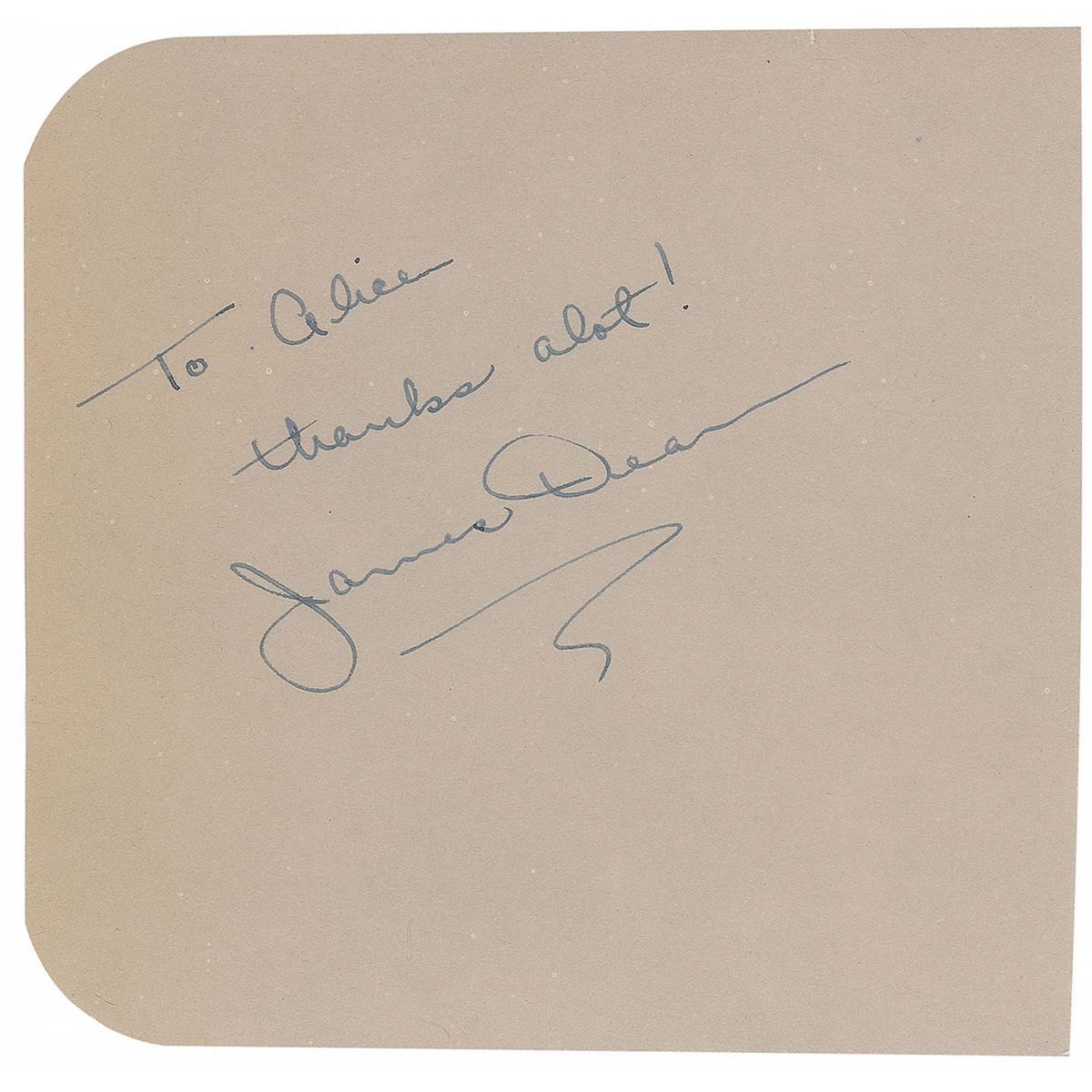Beautiful vintage fountain pen signature and inscription, “To Alice, thanks alot! James Dean,” on an off-white 5.5 x 5.5 album page. In fine condition.