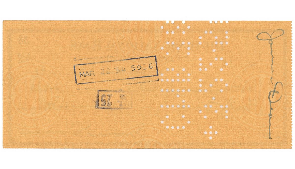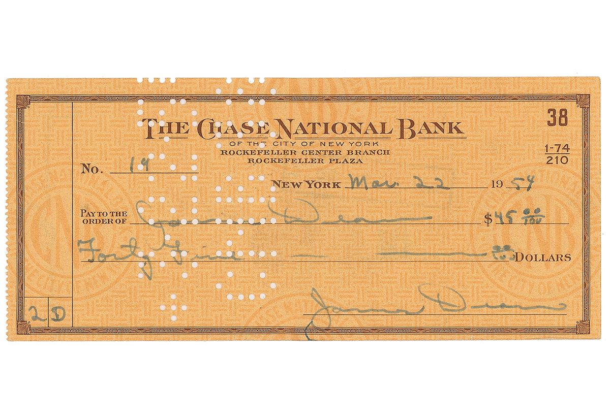 Chase National Bank check, 6.25 x 2.75, filled out and signed by Dean, “James Dean,” payable to himself, “James Dean,” for $45, March 22, 1954, and again endorsed on the reverse, “James Dean.” In fine condition, with expected bank stamps and cancellation holes (only affecting his signature in the payee field), and a stray mark at the bottom edge just touching the first letter of his signature. Within two weeks of writing this check, Dean would be cast as Cal Trask in the screen adaptation of Steinbeck’s East of Eden, departing from New York on April 8, 1954, bound for Hollywood to begin shooting. An excessively rare Dean item signed three times from the period he embarked on his short but bright cinematic career.