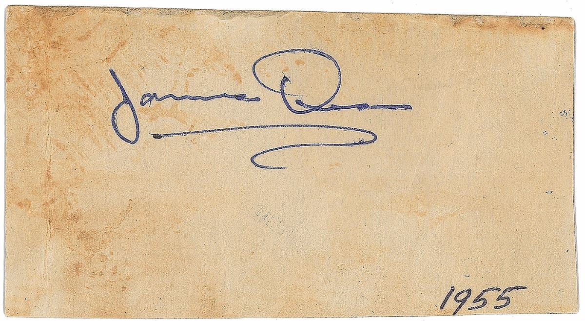 Sought-after vintage fountain pen signature, “James Dean,” on an off-white 3 x 1.5 slip bearing a collector’s date notation of 1955. Affixed to a same-size card. In very good condition, with toned adhesive residue and staining.