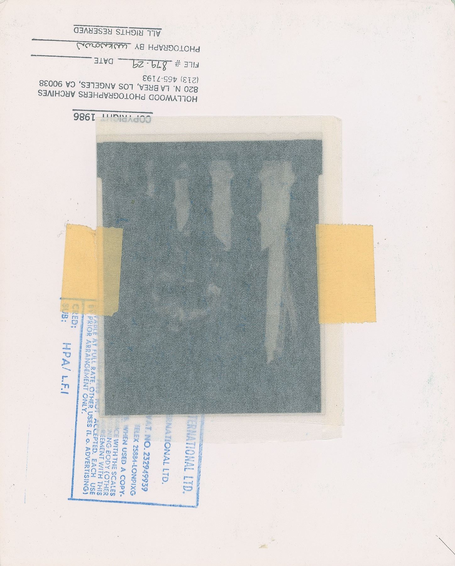 Original semi-glossy 8 x 10 silver gelatin photograph of James Dean smiling behind a white picket fence. Reverse bears a London Features International stamp and a 1986 Hollywood Photographers Archives stamp; a sleeve taped to the reverse contains a 3.75 x 4.75 negative of the image. In fine condition, with some very light rippling.