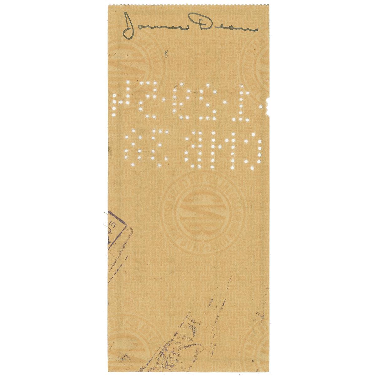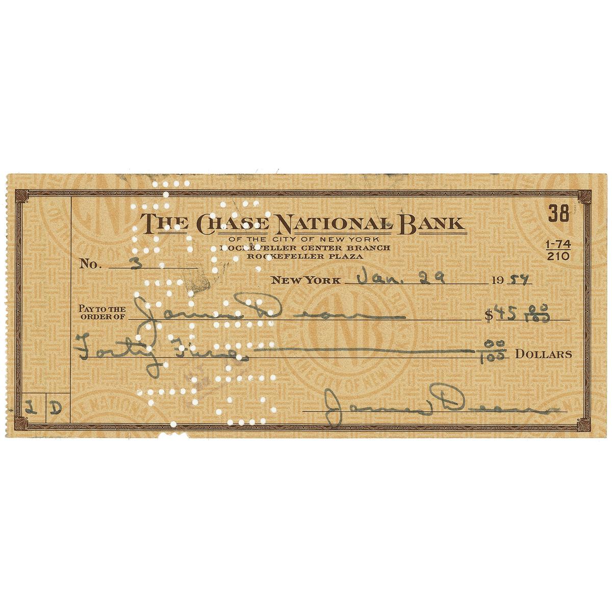 American actor (1931–1955) best known for his star turns in three 1950s screen classics: East of Eden, Rebel Without a Cause, and Giant. His untimely death in a high-speed car crash came to represent the very embodiment of the “live fast, die young” philosophy—and elevated him to the status of a legend that remains unique in the annals of Hollywood. Bank check, 6.25 x 2.75, filled out and signed by Dean, payable to James Dean for $45.00, January 29, 1954, and also endorsed on the reverse, “James Dean.” In fine condition, with an unobtrusive vertical fold through a single letter of the signature on the pay line and expected cancellation holes, affecting the same signature.