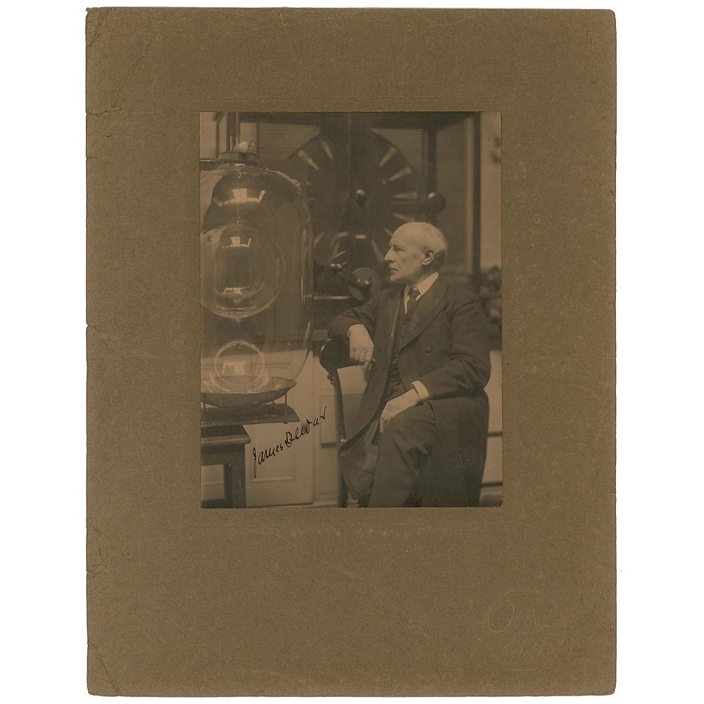 Scottish chemist and physicist (1842–1923) best known for his invention of the vacuum flask. Superb matte-finish 6 x 7.75 photo of Dewar posing beside an impressive flask, affixed to its original 10.5 x 13.75 mount, boldly signed on the image in fountain pen. Reverse is imprinted with the name of the photographer, M. Olive Edis. In fine condition, with creasing and edge to the mount, in no way affecting the signed image.