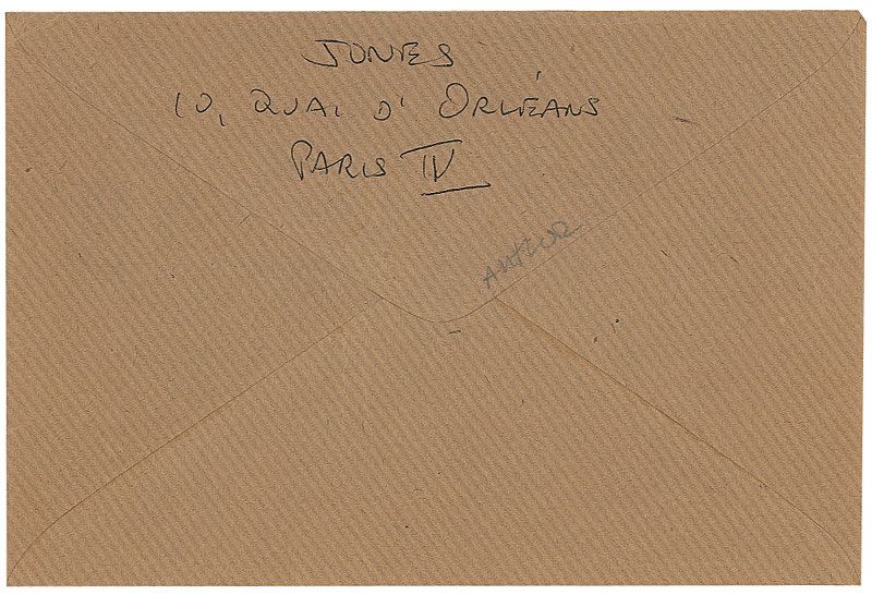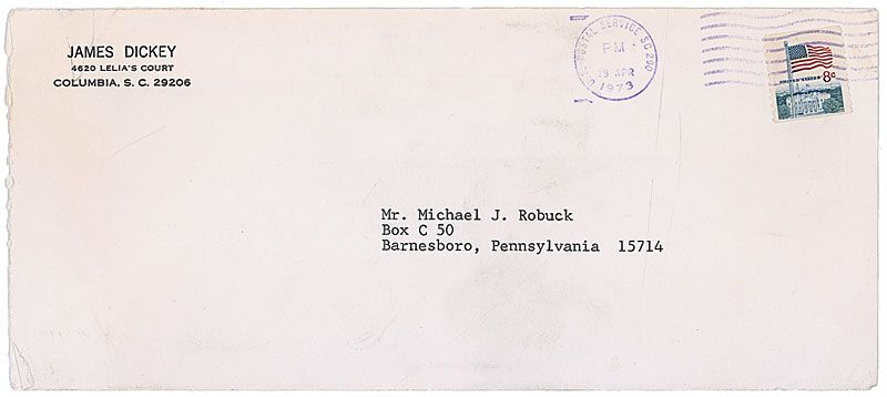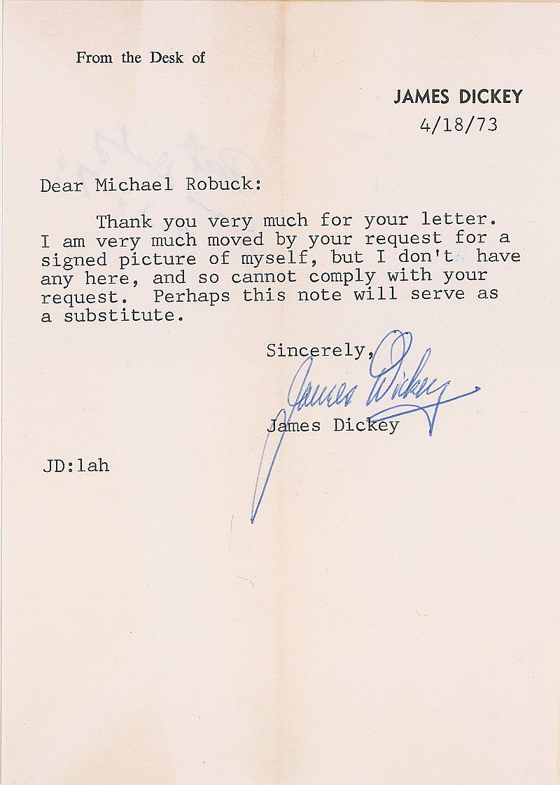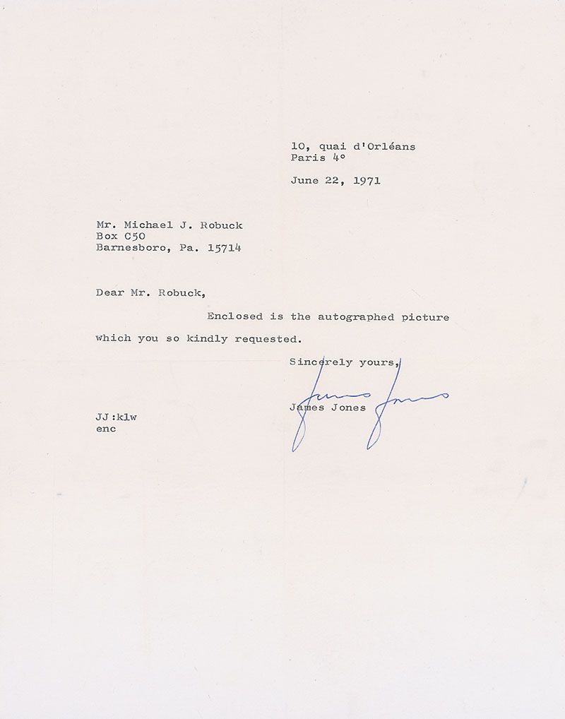 Two letters: one TLS signed “James Dickey,” one page, 5 x 7, personal letterhead, April 18, 1973, responding to an autograph request; and one TLS signed “James Jones,” one onionskin page, 8.25 x 10.5, personal letterhead, June 22, 1971, also responding to an autograph request. In overall fine condition. Both are accompanied by their original mailing envelope.