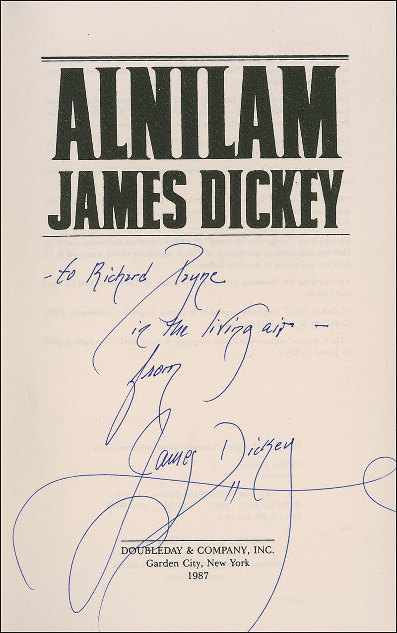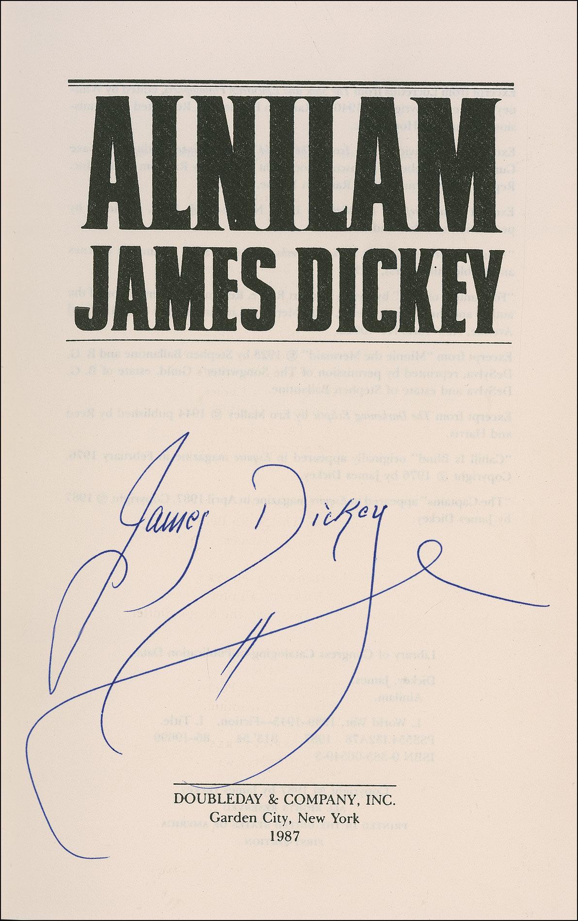 Two hardcover first editions of Alnilam, each signed on the title page in blue ink, with Dickey adding an inscription to one book. In fine condition.