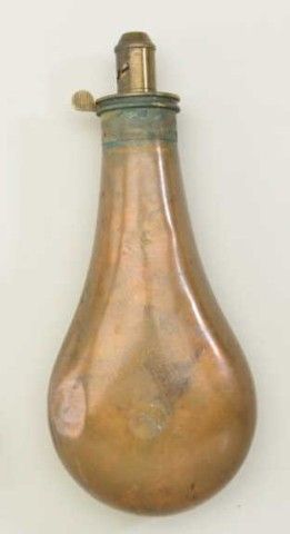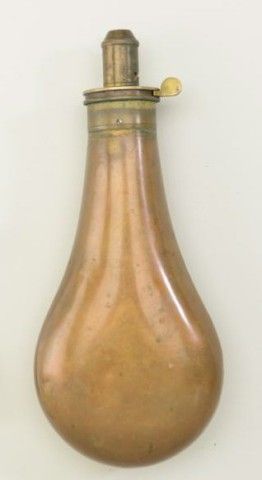 James Dixon & Sons Sheffield marked mid 19th century shotgun flask with plain body and 4 stage charger graduated from 2-1/4 to 3 drams of powder. The flask measures nearly 9" from tip to end and almost 4" across. Theflask is in good condition with a few dents and nice patina, working spring. Est.$75-$150.