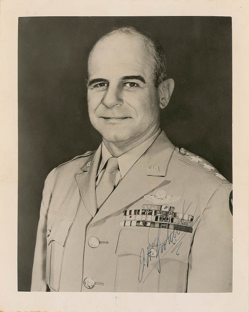 Vintage matte-finish 8 x 10 photo of Doolittle in uniform, signed in fountain pen, “J. H. Doolittle.” Scattered creases and wrinkles, primarily from mounting remnants on reverse, and a light stain to top left corner, otherwise fine condition.