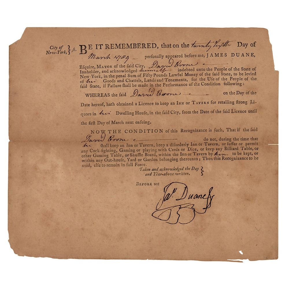 Partly-printed DS, signed “Jas. Duane,†one page, 7.5 x 6.5, March 26, 1789. Document regarding the issuance of a "Licence to keep an Inn or Tavern for retailing strong Liquors in his Dwelling House," under the promise that he not "permit any Cock-fighting, Gaming or playing with Cards or Dice, or keep any Billiard Table." In very good to fine condition, with minor loss along the edges, and splitting to the central horizontal fold.