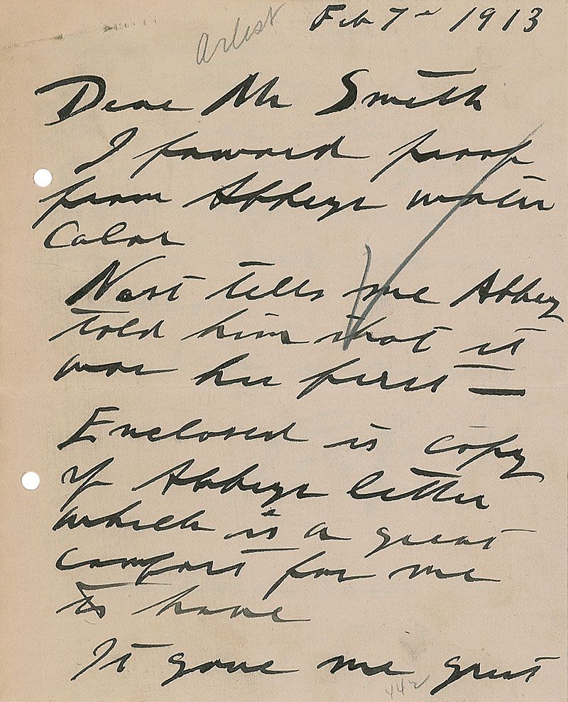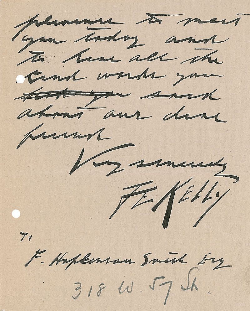 American sculptor and illustrator (1855–1933) especially known for his depictions of the Civil War. ALS signed “J. E. Kelly,” two pages on two adjoining sheets, 5 x 6.5, February 7, 1913. Letter to F. Hopkinson Smith about his friend and fellow artist, Edwin Austin Abbey. In part: “I forward proof from Abbey’s watercolor. Nast tells me Abbey told him that it was his first—Enclosed is a copy of Abbey’s letter which is a great comfort for me to have.” Staple holes to the upper left and filing holes to the left border, light scattered soiling, and a few pencil notations, otherwise fine condition. Accompanied by the typed copy of Abbey’s letter referred to, which mentions some of Kelly’s influences—Walt Whitman and Winslow Homer.