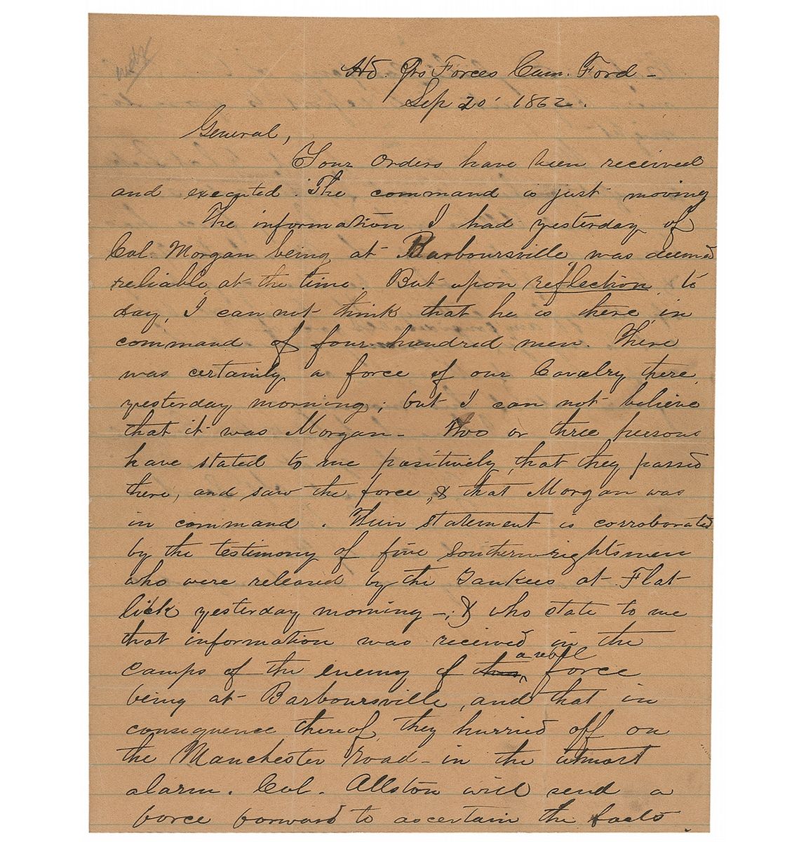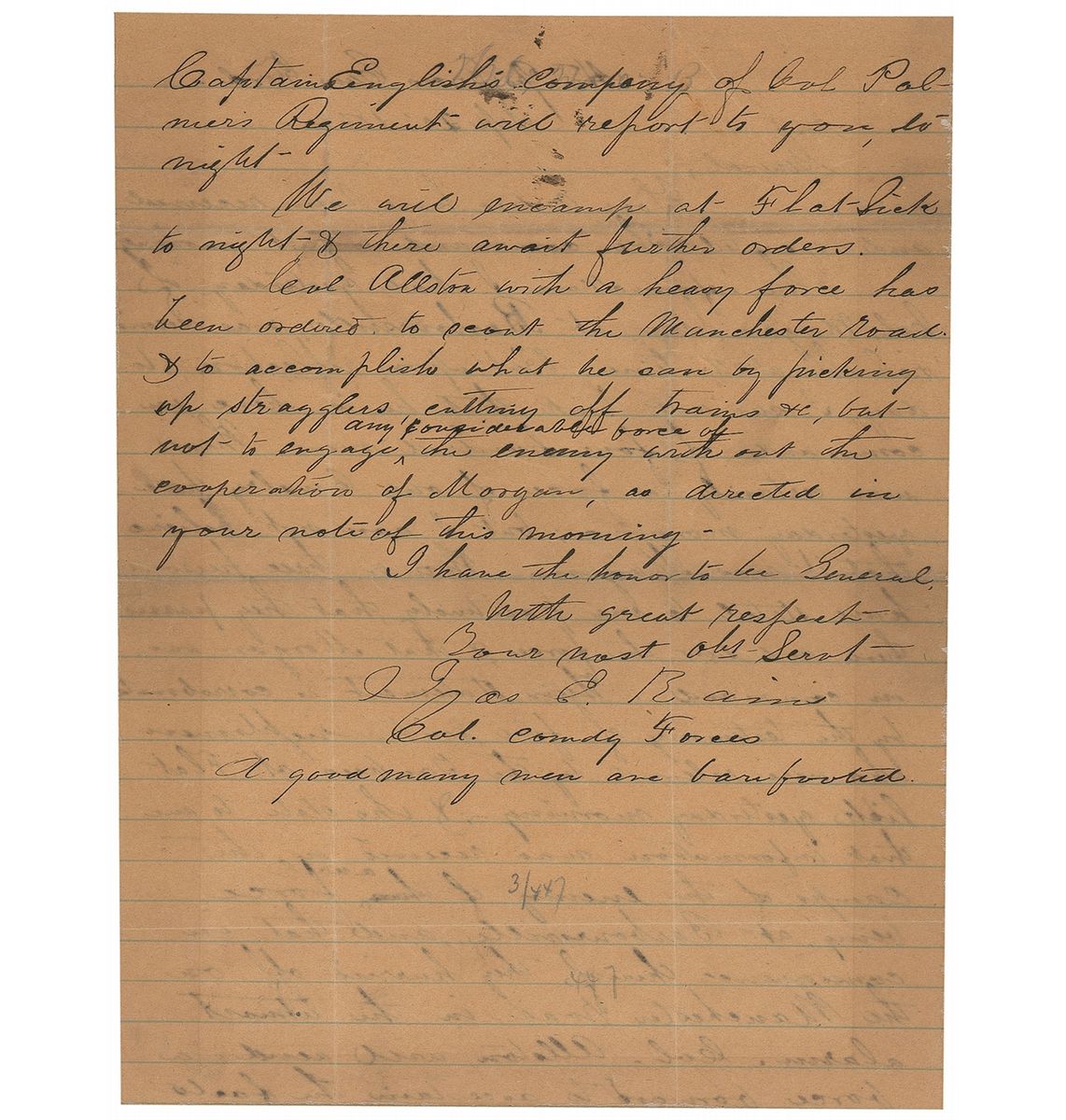 Confederate officer (1833–1862) who fought at Cumberland Gap and was killed in action while leading his brigade charge against Union artillery emplacements during the Battle of Stones River at Murfreesboro. Civil War–dated LS signed “Jas. E. Rains,” one page, lightly-lined both sides, 6.75 x 9, Hd. Qrs. Forces Cum[berland] Ford, September 20, 1862. Letter to a general. In full: "Your orders have been received and executed. The command is just moving. The information I had yesterday of Col. Morgan being at Barboursville was deemed reliable, at the time. But upon reflection, today, I cannot think that he is there in command of four hundred men. There was certainly a force of our cavalry there yesterday morning; but I cannot believe that it was Morgan. Two or three persons have stated to me positively, that they passed there, and saw the force, & that Morgan was in command. Their statement is corroborated by the testimony of five Southern rights men who were released by the Yankees at Flat Lick yesterday morning—; & who state to me that information was received in the camps of the enemy of a rebel force being at Barboursville, and that in consequence thereof they hurried off on the Manchester Road, in the utmost alarm. Col. Allston will send a force forward to ascertain the facts. Captain English’s company of Col. Palmer's regiment will report to you, tonight. We will encamp at Flat Lick tonight and there await further orders. Col. Allston with a heavy force has been ordered to scout the Manchester Road, & to accomplish what he can by picking up stragglers, cutting off trains &c, but not to engage any considerable force of the enemy with out the cooperation of Morgan, as directed in your note of this morning." Followed by a brief postscript, in full: "A good many men are barefooted." Professionally inlaid into a larger off-white sheet. In fine condition, with unobtrusive intersecting folds (one vertical fold passing through first letter of his last name), and overall toning. Earlier in 1861 and 1862, Rains had successfully defended the Cumberland Gap from numerous Union attacks; however, Union forces led by General George W. Morgan finally outflanked Rains and took the position in June 1862. Just three days before Rains wrote this letter, Confederate troops forced Morgan to begin retreating from the key location. Later that year, on December 31, 1862, Rains was shot through the heart and killed instantly. An extraordinarily rare letter, this is especially desirable as it dates to the time and place of Rains’s most valuable contributions during battle.