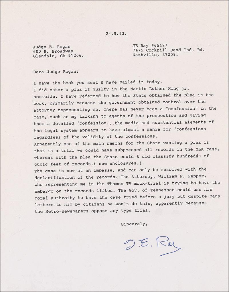 Controversial figure (1928–1998) convicted and jailed for the 1968 assassination of Martin Luther King, Jr. TLS signed “J. E. Ray,” one page, 8.5 x 11, May 24, 1993. Ray writes to a judge in California. In part: “I did enter a plea of guilty in the Martin Luther King, Jr. homicide. I have referred to how the State obtained the plea in the book, primarily because the government obtained control over the attorney representing me. There has never been a ‘confession’ in the case such as my talking to agents of the prosecution and giving them a detailed ‘confession…the media and substantial elements of the legal system appears to have almost a mania for ‘confessions’ regardless of the validity of the confessions.” In fine condition. RRAuction COA.