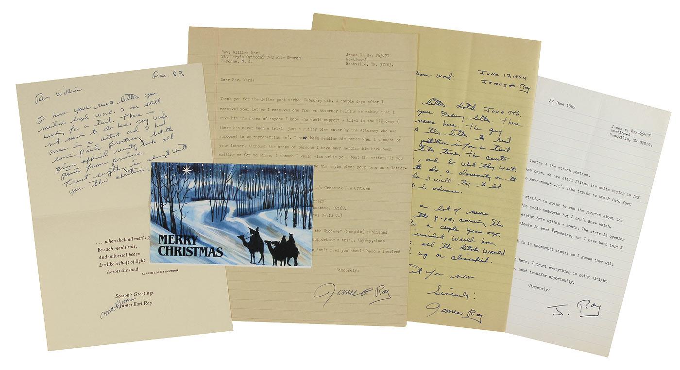 Controversial figure (1928–1998) convicted and jailed for the 1968 assassination of Martin Luther King. Six letters, all signed “James E. Ray,” consisting of two TLSs, a one-page ALS, and three short ALSs, all written inside of greeting cards, with all letters dating from the 1980s. One letter reads, in part: “I received [a letter] from an attorney helping me asking that I give him the names of anyone I know who would support a trial in the MLK case (there has never been a trial, just a guilty plea entered by the attorney who was supposed to be representing me).” At the end of the one-page ALS, Ray writes, “There has been a lot of news here lately about the pope [sic], concerning the attempt on his life a couple years ago, I suspect that if the incident would have happened in the U.S. all the details would have been hushed up or classified.” In fine condition. Accompanied by four of the original mailing envelopes.