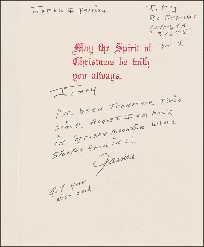 Christmas card from 1987, measuring 5 x 6.5 closed and bearing a winter scene on the front. Inside bears a brief ALS to James I. Parrish. In full: “I’ve been transfere [sic] twice since August. I am back in Brushy Mountain where started from in 81.” Signed “James” with the added postscript, “Got your nice card.” In fine condition.