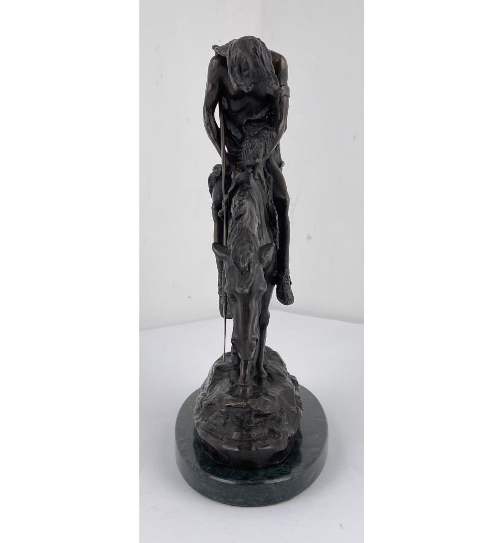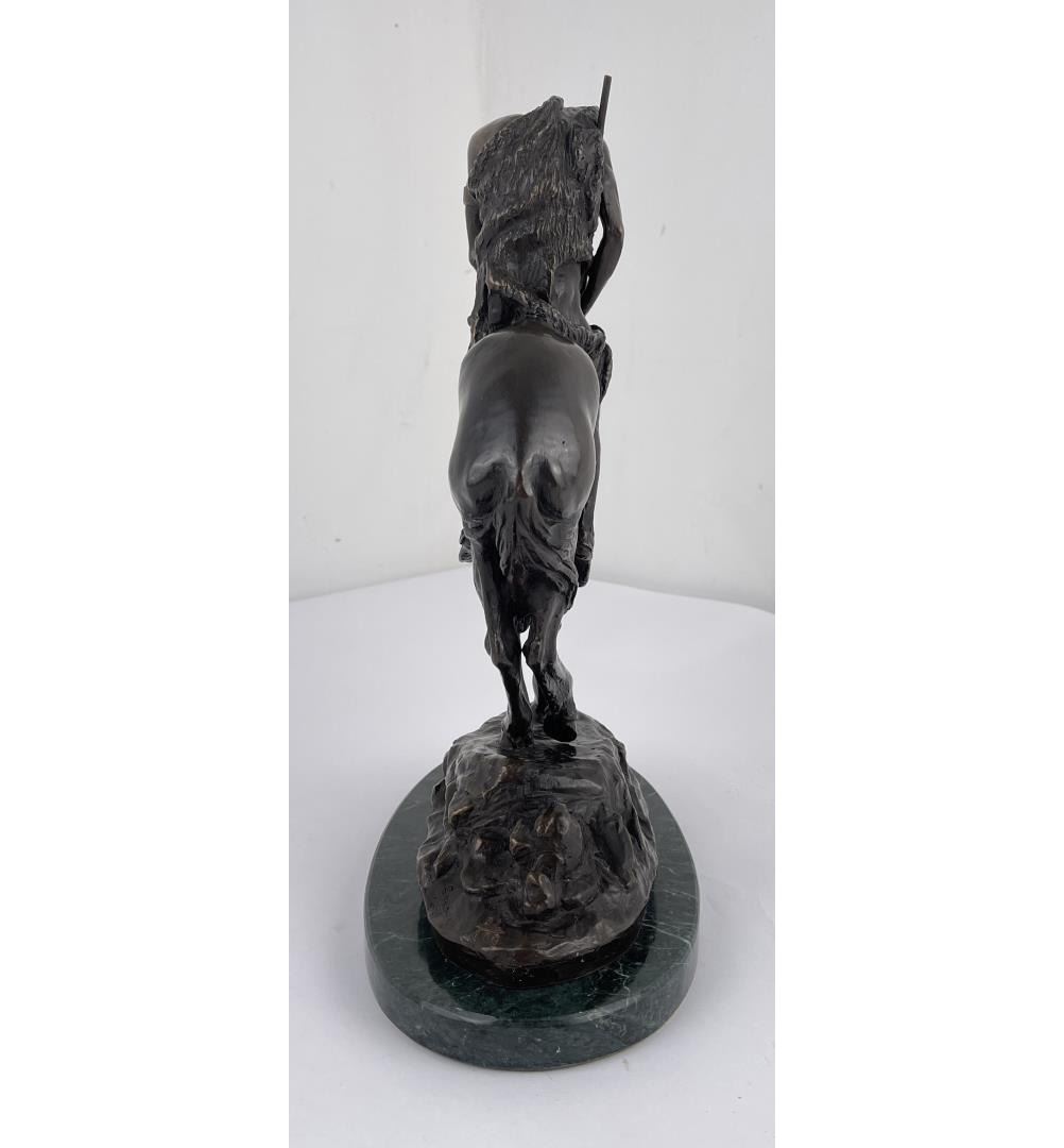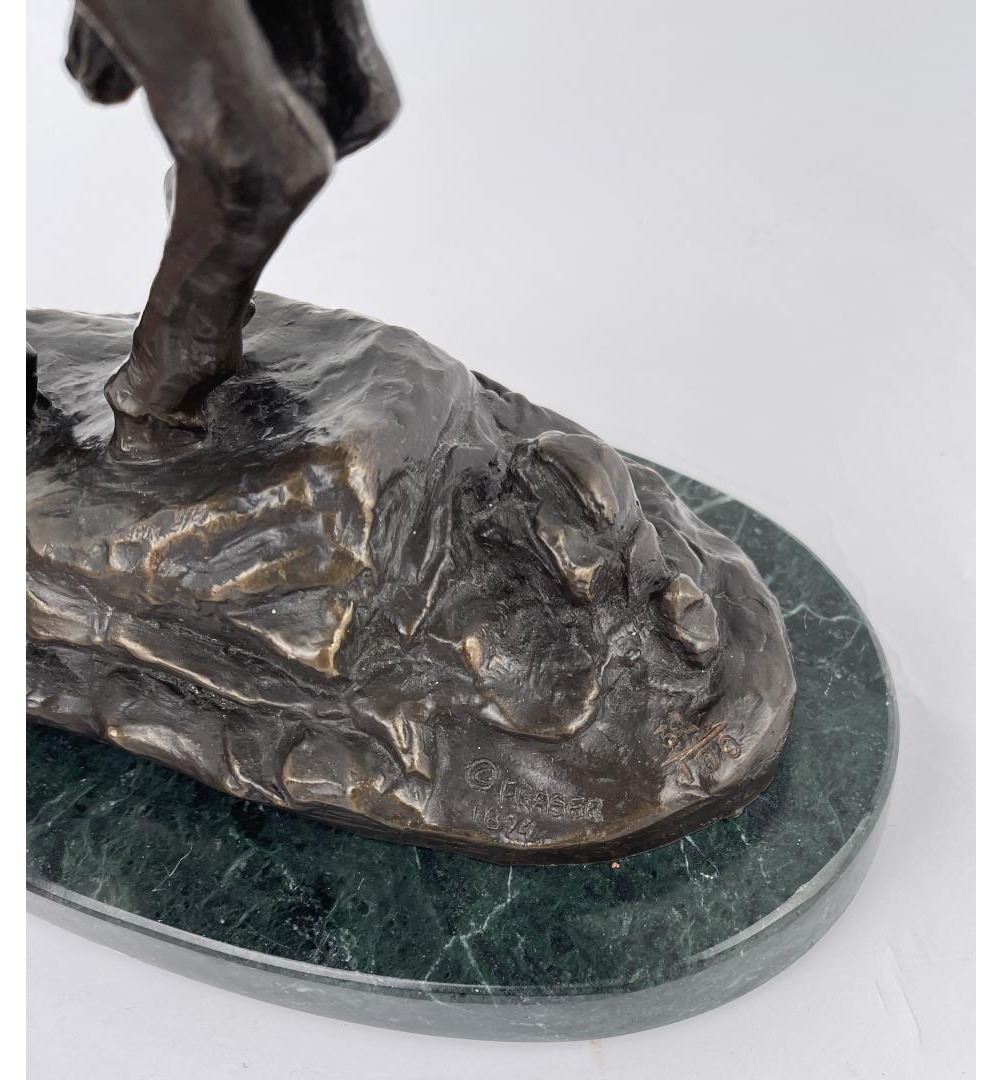 Approximately 13 1/2" tall James Earle Fraser (1876 - 1953) was active/lived in New York, New Hampshire, Connecticut, Minnesota. James Fraser is known for Indian figure sculpture, coin design. Having spent his childhood in the West, James Earle Fraser became one of the more famous American sculptors of cowboys, Indians, and horses. He also designed the Buffalo Nickel, which "has been called the first uniquely American coin." (Reynolds, 189). From 1920 to 1925, he served on the National Arts Commission, and played a key role in promoting American subject matter in public art. In 1919, he received the Saltus Medal*, the most prestigious medallic art award. He attended public school in Minneapolis, but lived much of the time in a railway car crossing through the Dakotas because his father was in charge of laying railroad track across the western plains. At age 18, with obvious art talent, he began studies at the Art Institute of Chicago* and there studied sculpture with Richard Bock. By age 20, he was a student in Paris at the Ecole des Beaux-Arts* and also studied at the Julian* and Colarossi Academies*. At age 22, he became an assistant in New York City to Augustus Saint- Gaudens before opening his own studio in New York. He "was probably Saint-Gauden's favorite assistant." (Reynolds, 189). Fraser's first important commission was a bust of Theodore Roosevelt in 1908. In 1913, he designed the U.S. "Buffalo Nickel, using three different Indians to get the single portrait. The bison on the reverse side was modeled after Black Diamond, a buffalo at the New York Zoo, and the Indian was modeled from three different persons whom Fraser knew: Chief Iron Trail, John Big Tree, and Two Moons. Two years later he completed his most memorable work, The End of the Trail, a dejected Indian sitting on a horse. Cast at the Roman Bronze Works*, it was originally modeled in 1894. The Seneca Chief John Big Tree was the model for the figure, which symbolizes the fate of the American Indians. A small version was exhibited at the Paris Salon* of 1898 where it won the American Artists Association John Wanamaker Prize. The 18-foot sculpture was exhibited at the Panama-Pacific Exposition* in San Francisco in 1915. The original 18 foot plaster version was acquired in 1968 and restored by the National Cowboy Hall of Fame in Oklahoma City. Fraser was married to Laura Gardin, also an accomplished sculptor.
