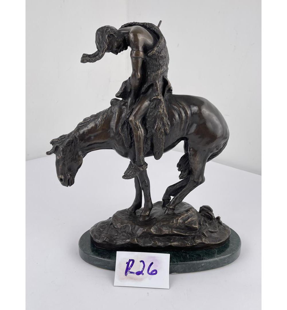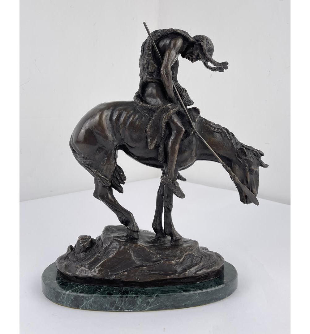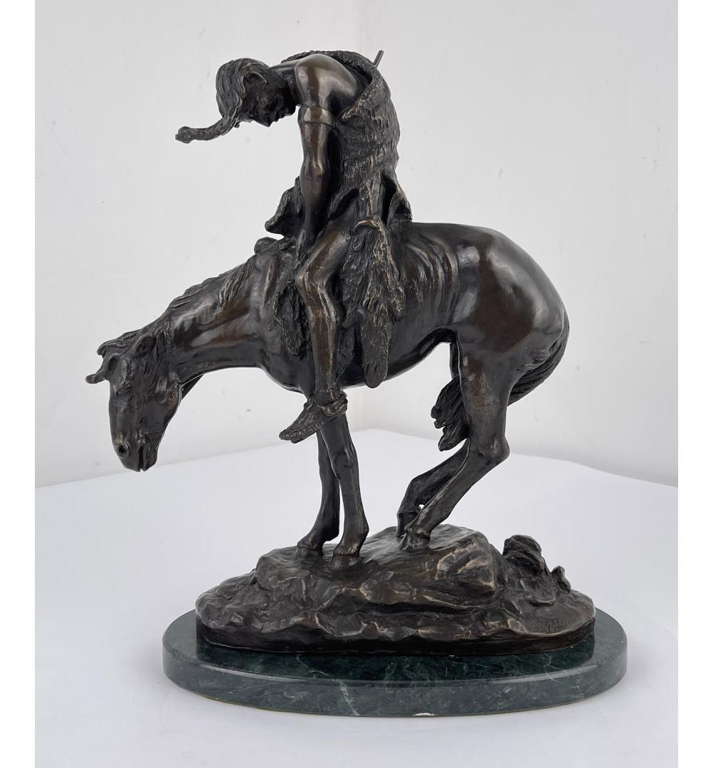 Approximately 13 1/2" tall James Earle Fraser (1876 - 1953) was active/lived in New York, New Hampshire, Connecticut, Minnesota. James Fraser is known for Indian figure sculpture, coin design. Having spent his childhood in the West, James Earle Fraser became one of the more famous American sculptors of cowboys, Indians, and horses. He also designed the Buffalo Nickel, which "has been called the first uniquely American coin." (Reynolds, 189). From 1920 to 1925, he served on the National Arts Commission, and played a key role in promoting American subject matter in public art. In 1919, he received the Saltus Medal*, the most prestigious medallic art award. He attended public school in Minneapolis, but lived much of the time in a railway car crossing through the Dakotas because his father was in charge of laying railroad track across the western plains. At age 18, with obvious art talent, he began studies at the Art Institute of Chicago* and there studied sculpture with Richard Bock. By age 20, he was a student in Paris at the Ecole des Beaux-Arts* and also studied at the Julian* and Colarossi Academies*. At age 22, he became an assistant in New York City to Augustus Saint- Gaudens before opening his own studio in New York. He "was probably Saint-Gauden's favorite assistant." (Reynolds, 189). Fraser's first important commission was a bust of Theodore Roosevelt in 1908. In 1913, he designed the U.S. "Buffalo Nickel, using three different Indians to get the single portrait. The bison on the reverse side was modeled after Black Diamond, a buffalo at the New York Zoo, and the Indian was modeled from three different persons whom Fraser knew: Chief Iron Trail, John Big Tree, and Two Moons. Two years later he completed his most memorable work, The End of the Trail, a dejected Indian sitting on a horse. Cast at the Roman Bronze Works*, it was originally modeled in 1894. The Seneca Chief John Big Tree was the model for the figure, which symbolizes the fate of the American Indians. A small version was exhibited at the Paris Salon* of 1898 where it won the American Artists Association John Wanamaker Prize. The 18-foot sculpture was exhibited at the Panama-Pacific Exposition* in San Francisco in 1915. The original 18 foot plaster version was acquired in 1968 and restored by the National Cowboy Hall of Fame in Oklahoma City. Fraser was married to Laura Gardin, also an accomplished sculptor.