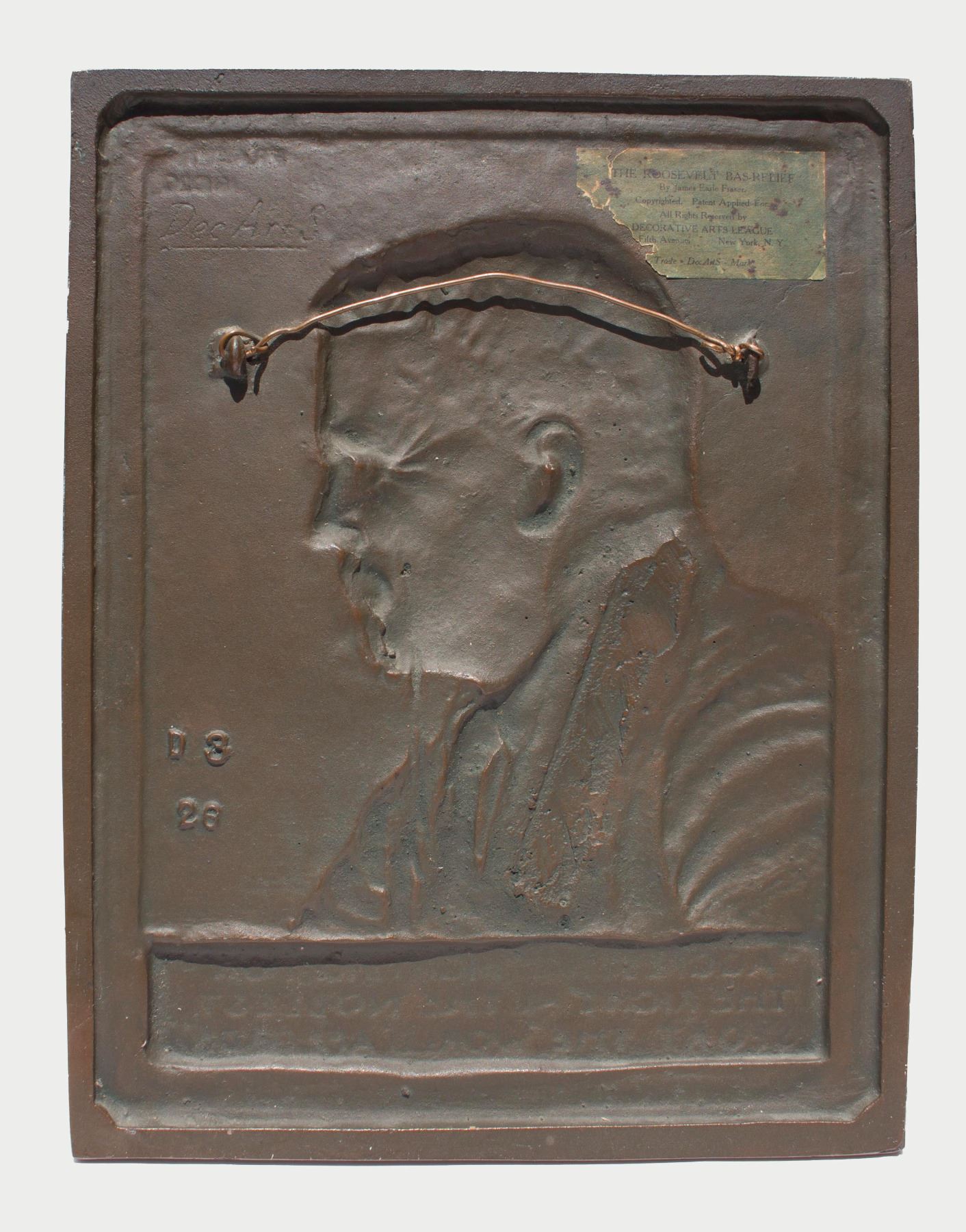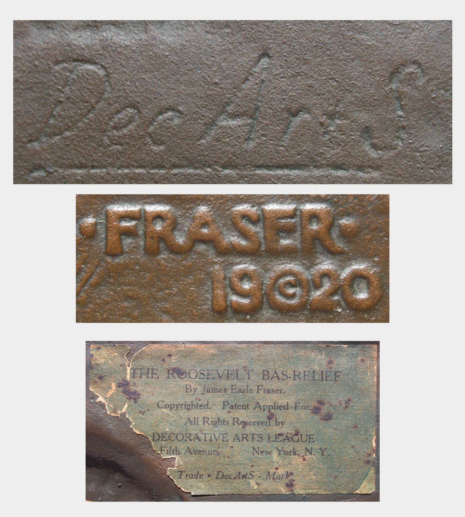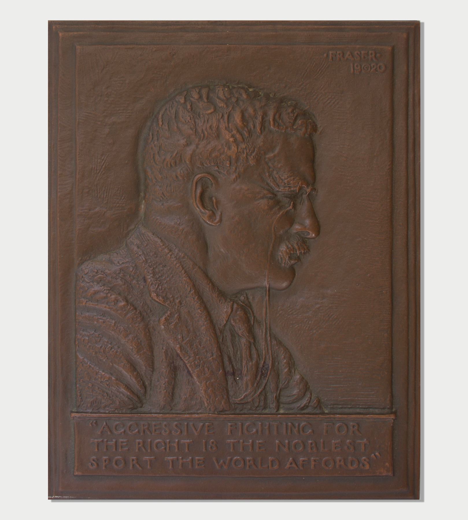 Theodore Roosevelt sculpture in bas-relief by noted sculptor James Earle Fraser, designer of the Indian Head nickel. Original bronze plaque shows Roosevelt in profile with his quote underneath, ''Aggressive fighting for the right is the noblest sport the world affords''. Also in relief at top is ''Fraser'' with 1920 copyright date, and ''D3 / 26'' on verso. Original label appears on verso, along with metal cord for hanging. Substantial plaque weighs 8 lbs and measures 10'' x 12.75''. Very good to near fine condition.
