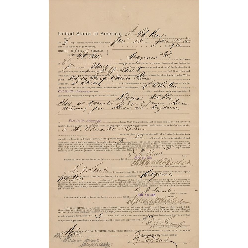 Scarce partly-printed DS, signed twice as “J. E. Reed,” one page, 8.25 x 13.75, January 19, 1895. Document granting Reed $9 in expenses for serving on a posse. In part: “I, J. Ed. Reed of Wagoner, I.T.…proceeded in company with said Marshal [C. J. Lamb] to…Ind. Ter. where we arrested George & James Pierce returning from thence via Wagoner to Ft. Smith.” Signed twice below by James Eddie Reed, and countersigned by George J. Crump as U.S. Marshal, Stephen Wheeler as U.S. District Court Clerk, C. J. Lamb as Deputy Marshal, and Ellyn Small as U.S. District Attorney. In fine condition, with partial separations to folds.