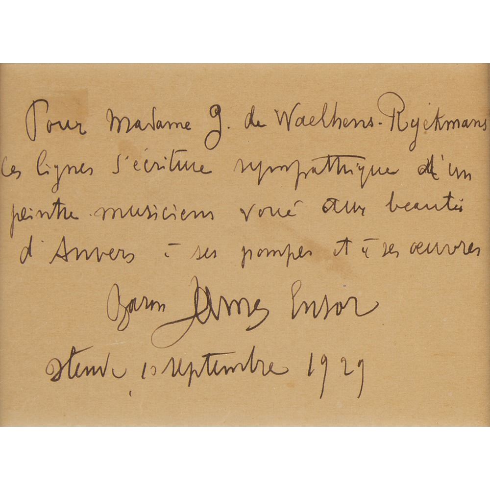 Belgian painter and printmaker (1860-1949) who was an important influence on expressionism and surrealism. ANS in French, one page, 4.75 x 3.5, September 10, 1929. An untranslated handwritten note from the artist, matted and framed to an overall size of 9 x 8. In fine condition, with some faint stains.