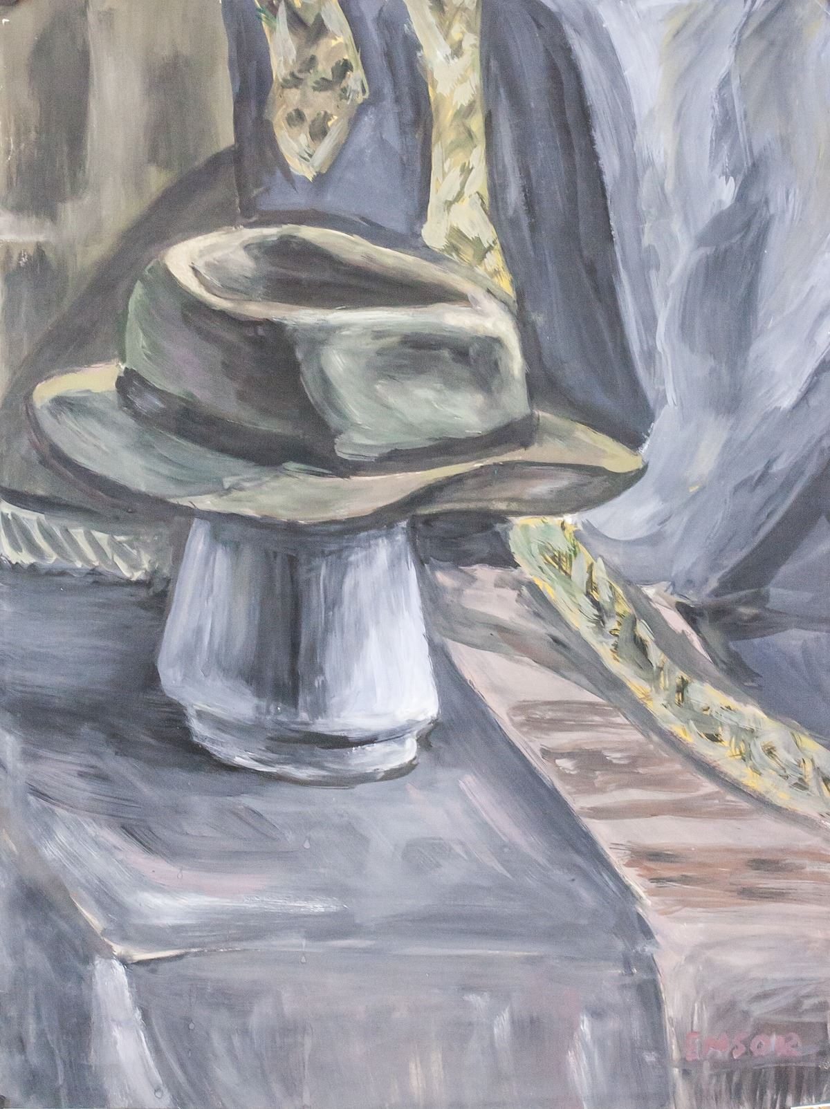 Gouache on paper. Featuring still-life of a hat resting on a stand. Signed "ENSOR" in the bottom right corner. Attributed to James Ensor (1860-1949, Belgian). 66 x 50 cm (26 x 19.75 in)