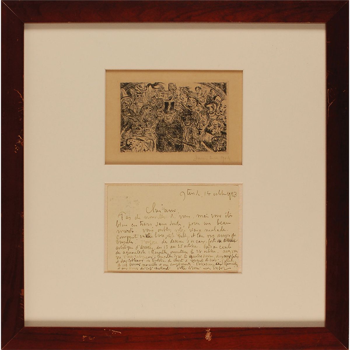 Belgian painter and printmaker (1860–1949) who was an important influence on expressionism and surrealism. ALS in French, signed “J. Ensor,” on a 5.25 x 3.5 postcard, October 14, 1923. Letter to Paul van der Borght. In part (translated): “I did not hear f