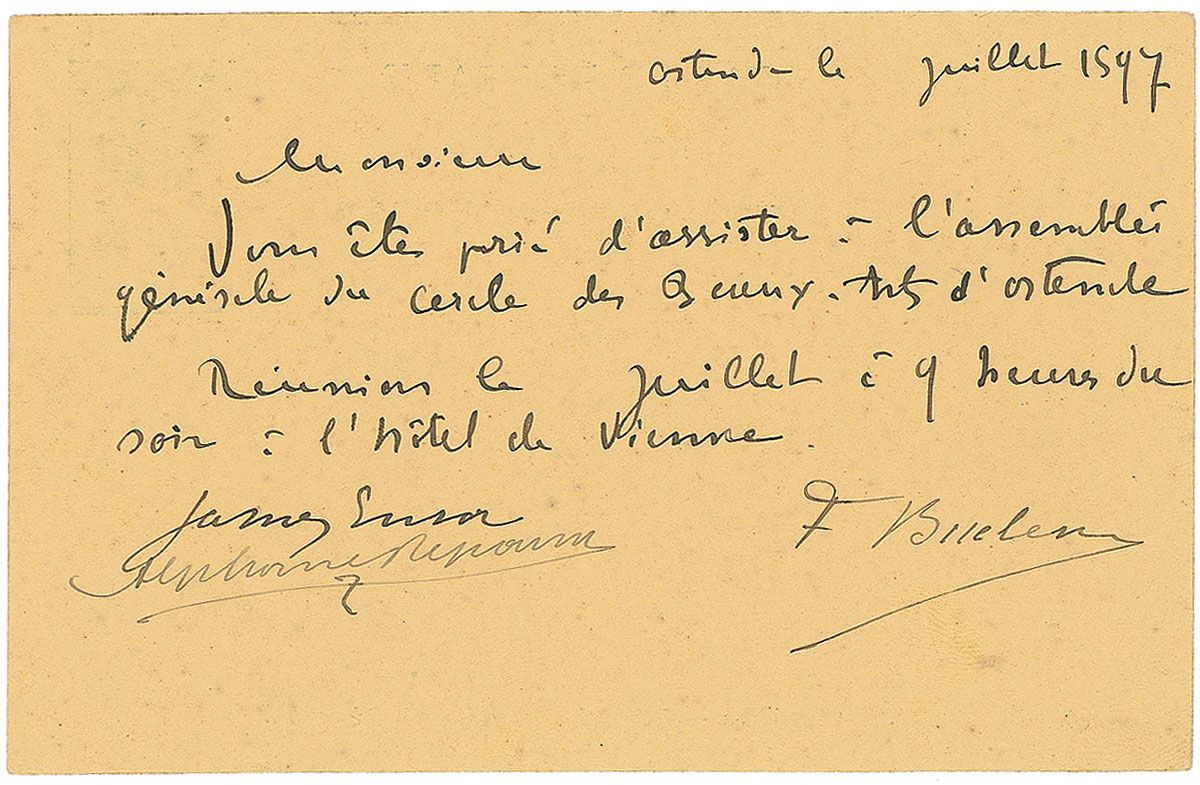 Belgian painter and printmaker (1860–1949) who was an important influence on expressionism and surrealism. Rare ALS in French, one page, 5.5 x 3.5, July 6, 1897. Letter is written to a fellow artist, inviting him to join the general assembly of the Ostende Circle of Fine Arts. Signed at the conclusion by Ensor, Felix Buelens, and one other. In fine condition.