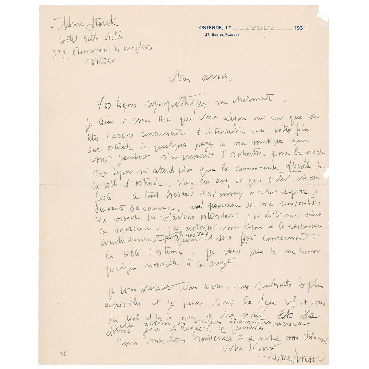 Belgian painter and printmaker (1860–1949) who was an important influence on expressionism and surrealism. ALS in French, one page, 8.75 x 10.75, personal letterhead, March 1931. Untranslated letter to Belgian author, filmmaker, and documentarian Henri Storck regarding a piece of music that Ensor had composed in 1923, and which Storck was hoping to use in one of his films. Partial separations to central vertical and horizontal folds, trivial creasing, and some chipping and paper loss to right edge, otherwise fine condition. Though best known for his artwork, Ensor was also an accomplished self-taught musician, composing his own pieces as early as 1905. Influenced by Ensor’s surrealist paintings, the avant-garde filmmaker Storck incorporated many themes of Flemish expressionism into his own movies, and even depicted Ensor—a frequent visitor at the Storck household—in the 1931 short film Idyll at the Beach.