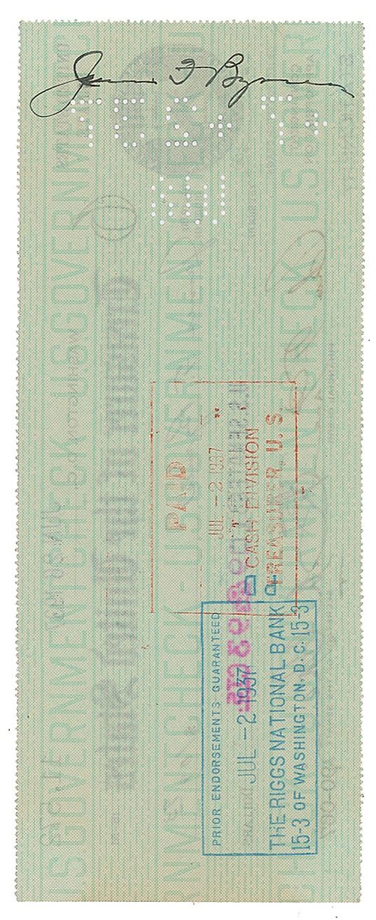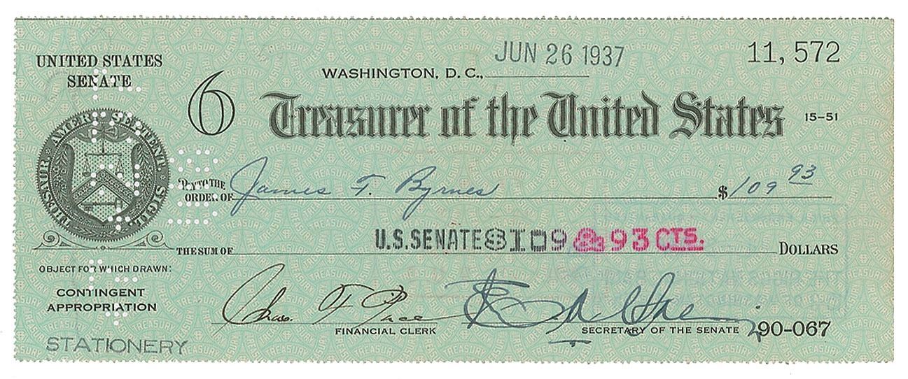 Treasurer of the United States/United States Senate check drawn for "Contingent Appropriation: Stationery," 8.5 x 3.25, filled out in another hand as payable to "James F. Byrnes" for $109.93, June 26, 1937, endorsed on the reverse by Byrnes, "James F. Byrnes." In fine condition. At this time, Byrnes was in his seventh year as a senator from South Carolina.