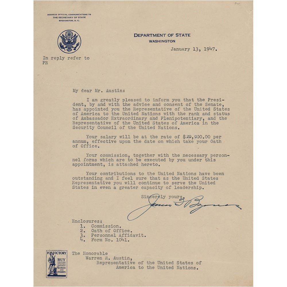 American judge and politician from South Carolina (1882–1972) who served the state as a congressman, senator, and as its 104th governor; additionally, he also served as a Supreme Court Justice and later as Secretary of State, making him one of the very few politicians to have served in the highest levels of all three branches of the American federal government while also being active in state government. TLS, one page, 8 x 10.5, Department of State letterhead, January 13, 1947. Letter to Warren Austin on his appointment as US Ambassador to the United Nations, in part: "I am greatly pleased to inform you that the President, by and with the advice and consent of the Senate, has appointed you the Representative of the United States of America to the United Nations with the rank and status of Ambassador Extraordinary and Plenipotentiary, and the Representative of the United States of America in the Security Council of the United Nations. Your salary will be at the rate of $20,000.00 per annum, effective upon the date on which you take your Oath of Office." In fine condition.