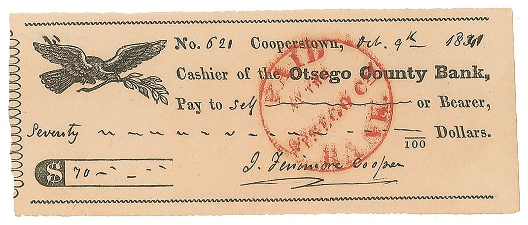 Otsego County Bank check, 5.5 x 2.25, filled out and signed by Cooper, "J. Fenimore Cooper," payable to Self for $70, October 9, 1841. In fine condition.