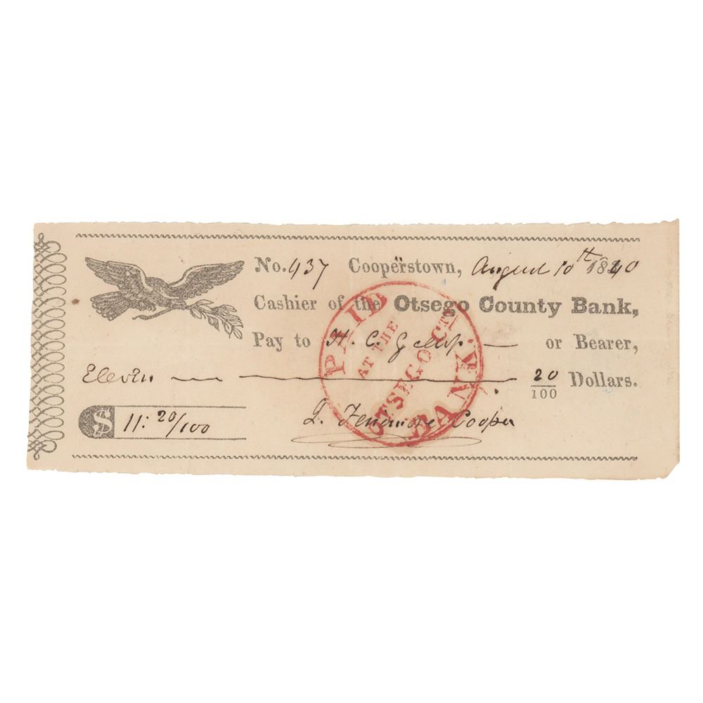 Otsego County Bank check, 5.75 x 2.25, filled out and signed by Cooper, "J. Fenimore Cooper," payable to H. C. Gallup for $11.20, August 10, 1840. In fine condition, with the ink stamp over portions of Cooper's signature.