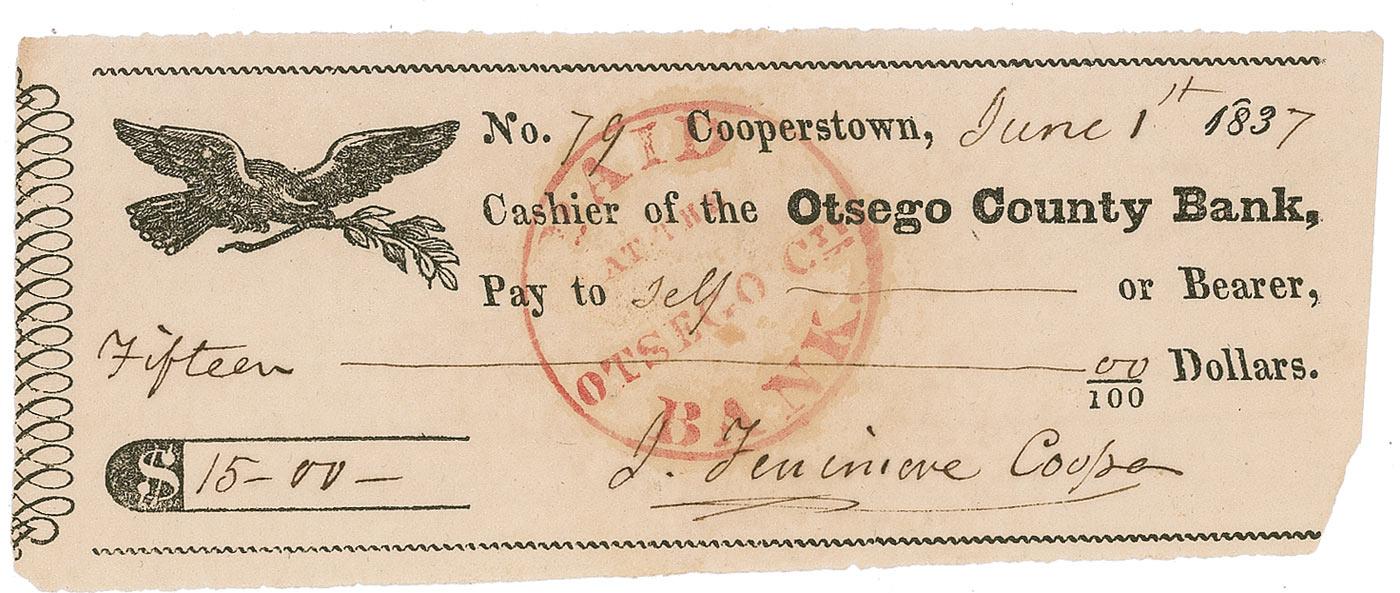 Bank check, 5.5 x 2.25, filled out and signed by Cooper, payable to Self for $15.00, June 1, 1837. In fine condition, with toning to bank stamp at center, lightly affecting a couple letters of signature, and an irregular right edge.