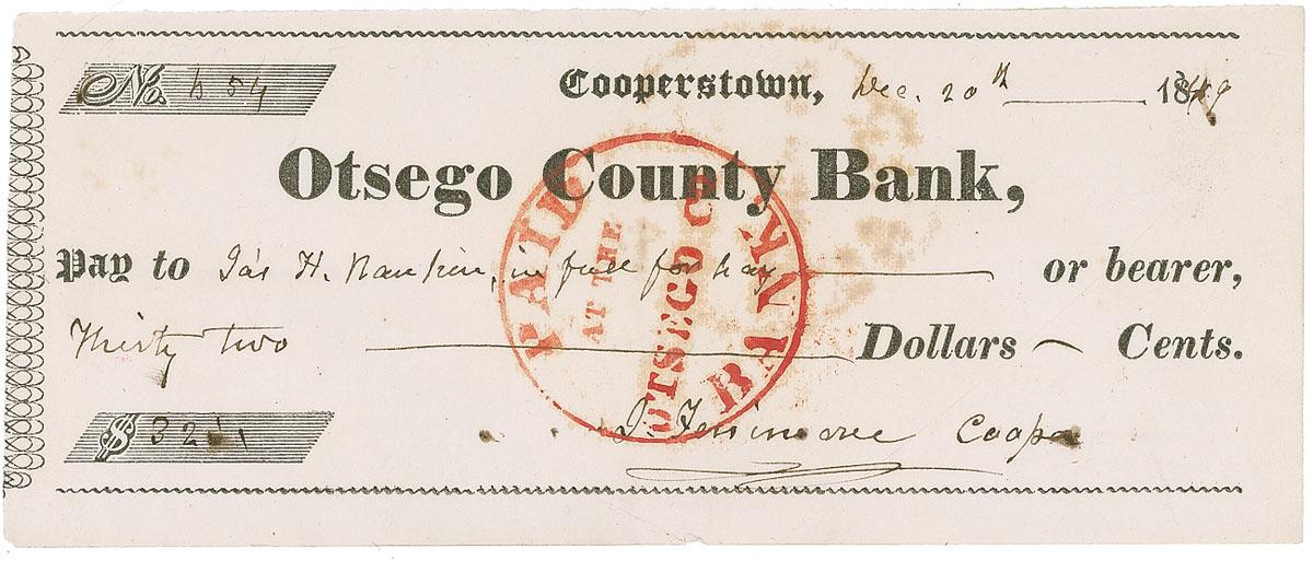 Bank check, 6.25 x 2.5, filled out and signed by Cooper, “J. Fenimore Cooper,” payable to Jas. H. Nankin, in full for pay for $32.00, December 20, 1849. Bisecting vertical fold, bank stamp over portion of signature, and show-through from another stamp, otherwise fine condition.