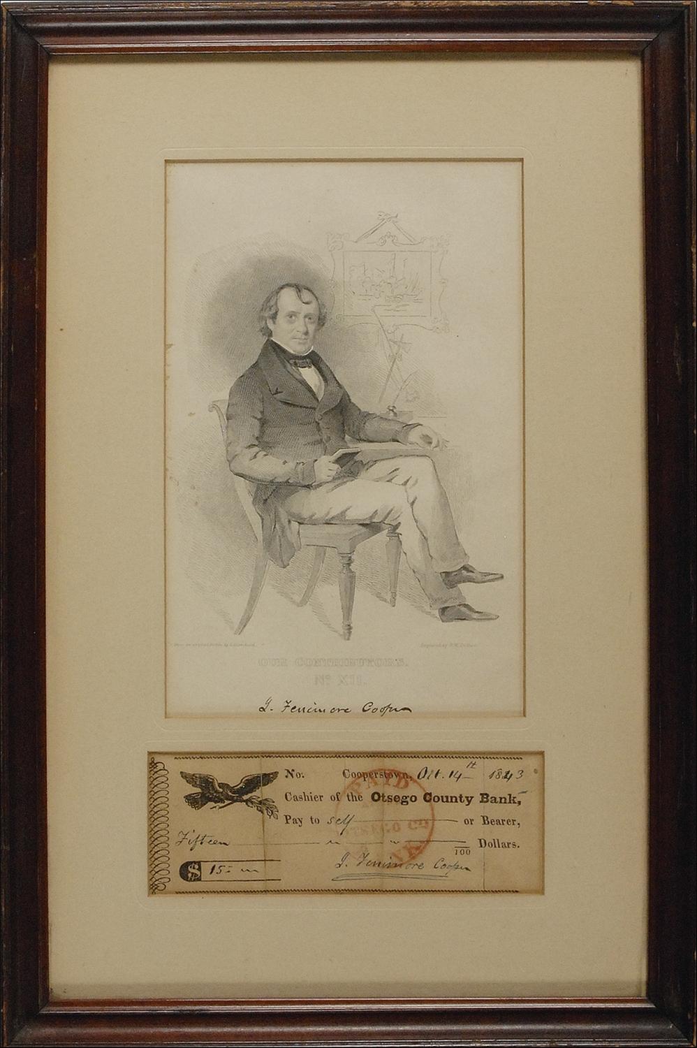 Bank check, 5.75 x 2, filled out and signed by Cooper, payable to Self for $15.00, October 14, 1843. Matted and framed with an engraved portrait of Cooper to an overall size of 10 x 15. In very good condition, with several vertical folds, one through a single letter of signature, uniform toning, and a bank stamp to body, lightly affecting middle name of signature.