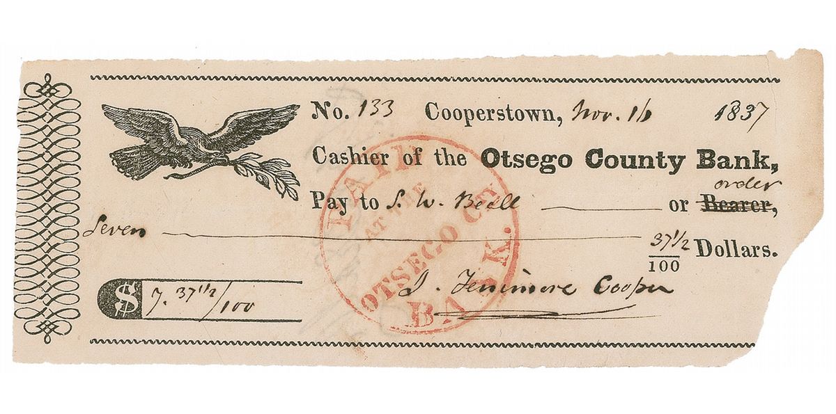 Bank check, 6 x 2.25, filled out and signed by Cooper, “J. Fenimore Cooper,” payable to S. W. Bell for $7.37 1/2, November 11, 1837. In very good condition, with light toning, the bottom right corner missing, light show-through from endorsement on the reverse, and the expected cancellation stamp affecting the first half of the signature.