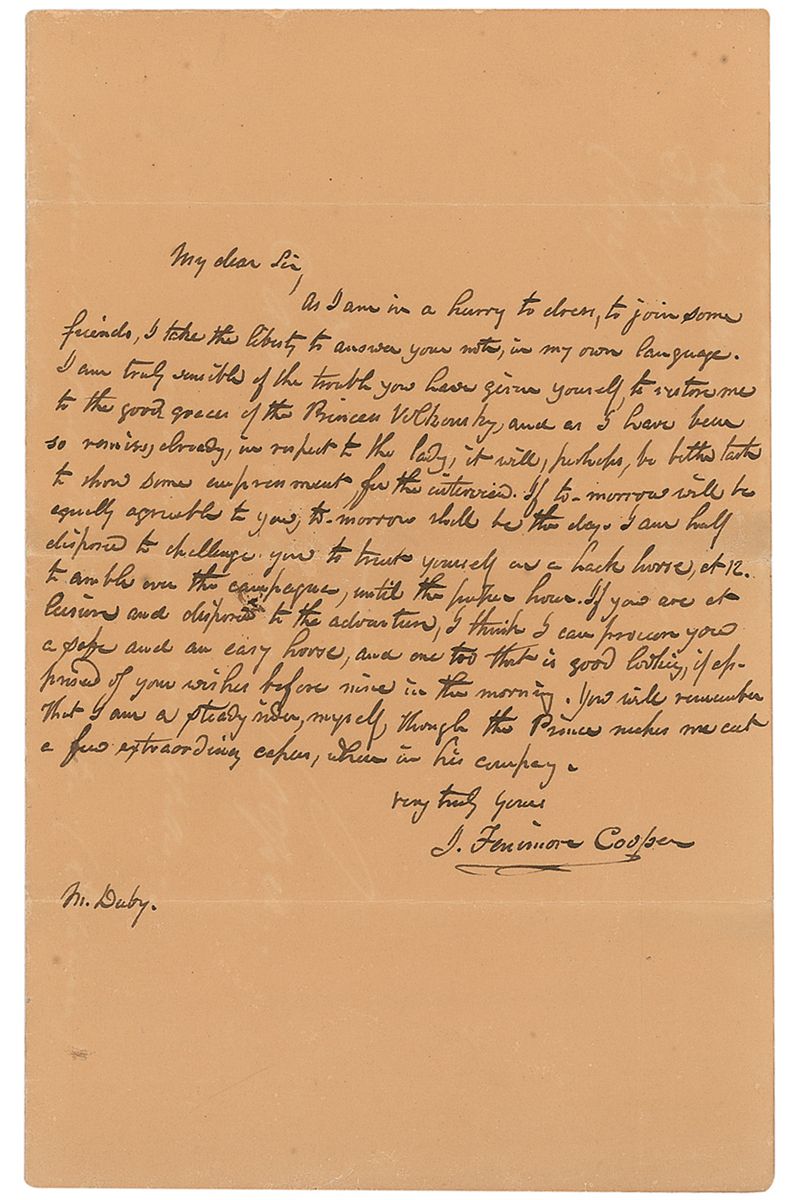 American writer (1789–1851) best known for his series of Leatherstocking Tales and the novel The Last of the Mohicans. ALS signed “J. Fenimore Cooper,” one page, 5 x 8, no date. Letter to Mr. Duby. In part: “As I am in a hurry to dress, to join some friends, I take the liberty to answer your note, in my own language. l am truly sensible of the trouble you have given yourself, to restore me to the good graces of the Princess Vilkousky, and as l have been so…already, in respect to the Lady, it will, perhaps, be better…to show some improvement, for the interview. lf tomorrow will be equally agreeable to you, tomorrow shall be the day…lf you are at leisure and disposed to the adventure, I think l can procure you a safe and an easy horse, and one too that is good looking, if apprised of your wishes before nine in the morning.” Second integral page is addressed in Cooper’s hand. In very good condition, with uniform toning, a vertical crease through a single letter of signature, and light edge wear.
