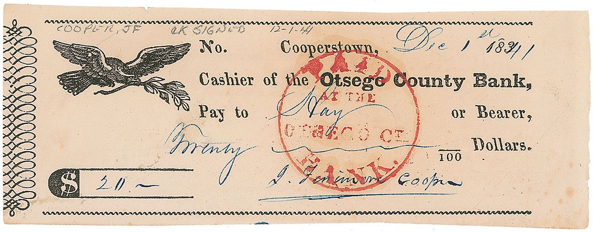 Business check, 6 x 2.25, filled out in another hand and signed by Cooper, payable to Hay for $20.00, December 1, 1841. In very good condition, with bank stamp over portion of signature, some light toning, and pencil notation along top edge.