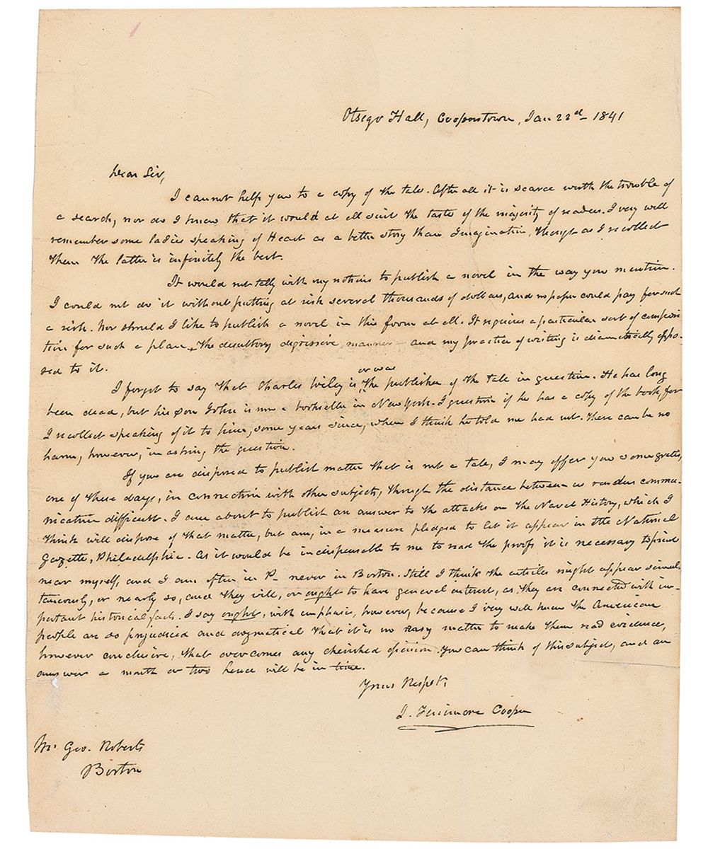 ALS signed “J. Fenimore Cooper,” one page, 7.75 x 9.75, January 22, 1841. Letter to Boston publisher George Roberts. In part: “I cannot help you to a copy of the tale. After all it is scarce worth the trouble of a search, nor as I know that it would at all suit the taste of the majority of readers. I very well remember some ladies speaking of Heart as a better story than Imagination. Though as I recalled than the latter is infinitely the best. It would not tally with my notion to publish a novel in the way you mention. I could not do it without putting at risk several thousands of dollars…Nor should I like to publish a novel in this form at all. It requires a particular sort of composition for such a plan & the desultory digressive manner—and my practice of writing is diametrically opposed to it…I am about to publish an answer to the attacks on the Naval History…Still I think the articles might appear simultaneously, or nearly so, and they will, or ought, to have general interest, as they are connected with important historical facts. I say ought, with complain, however, because I very well know the American people are so prejudiced and dogmatical that is no easy matter to make them read evidence, however conclusive, that overcomes any cherished opinion." In fine condition, with intersecting folds (one vertical fold passing through a single letter of the signature), a tiny hole to the lower left (affecting no writing), and slightly trimmed edges. Both stories Cooper mentions at the beginning, “Heart” and “Imagination”—which he had initially written and published many years before, in 1823—were then reprinted in Roberts’s Boston Notion periodical, with “Imagination” featured just a week after the date of this letter, and “Heart” appearing in March.