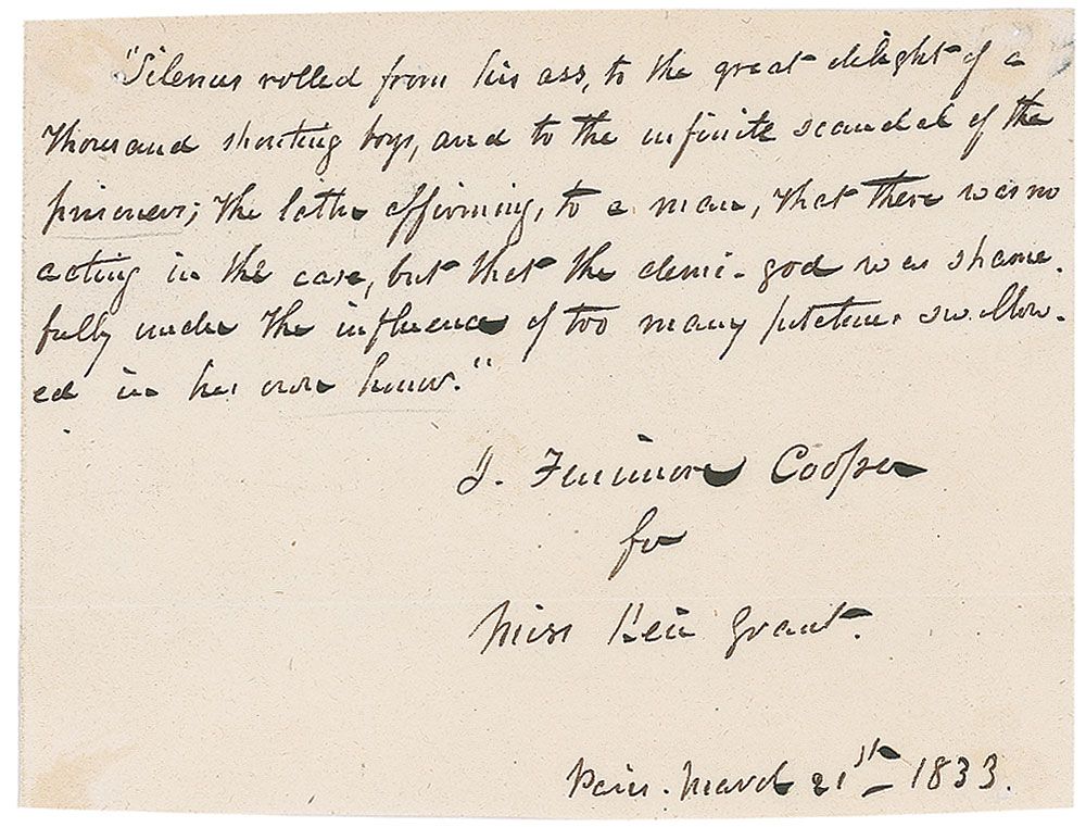 AQS on an off-white 4.5 x 3.5 sheet. Cooper pens a quote from chapter 16 of his work The Headsman, in full: “Silenus rolled from his ass, to the great delight of a thousand shouting boys, and to the infinite scandal of the prisoners; the latter affirming to a man, that there was no acting in the case, but that the demi-god was shamefully under the influence of too many potations swallowed in his honor.” Signed and inscribed at the bottom, “J. Fenimore Cooper for Miss…Grant, Paris, March 21st 1833.” In fine condition, with a horizontal fold to lower portion and slight paper loss to reverse corners from mounting remnants.