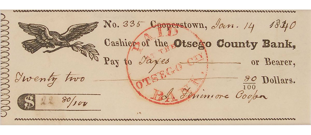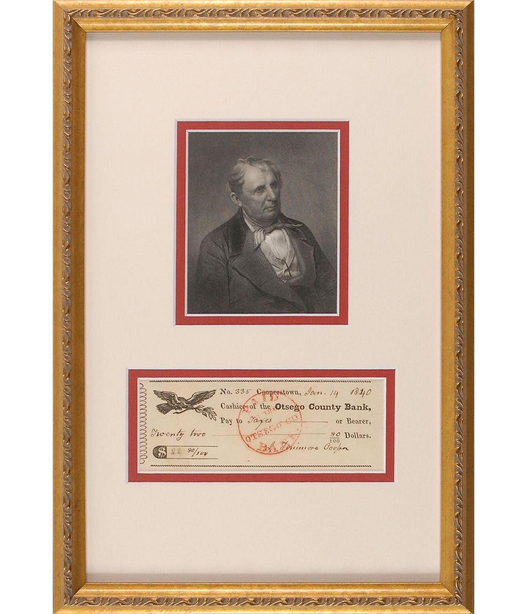 Bank check, 5.5 x 2, filled out and signed by Cooper, “J. Fenimore Cooper,” payable to taxes for $22, January 14, 1840. Nicely double-matted and framed with an engraved portrait of the author to an overall size of 9.5 x 14.5. In fine to very fine condition, with an expected bank stamp affecting the first few letters of the signature.