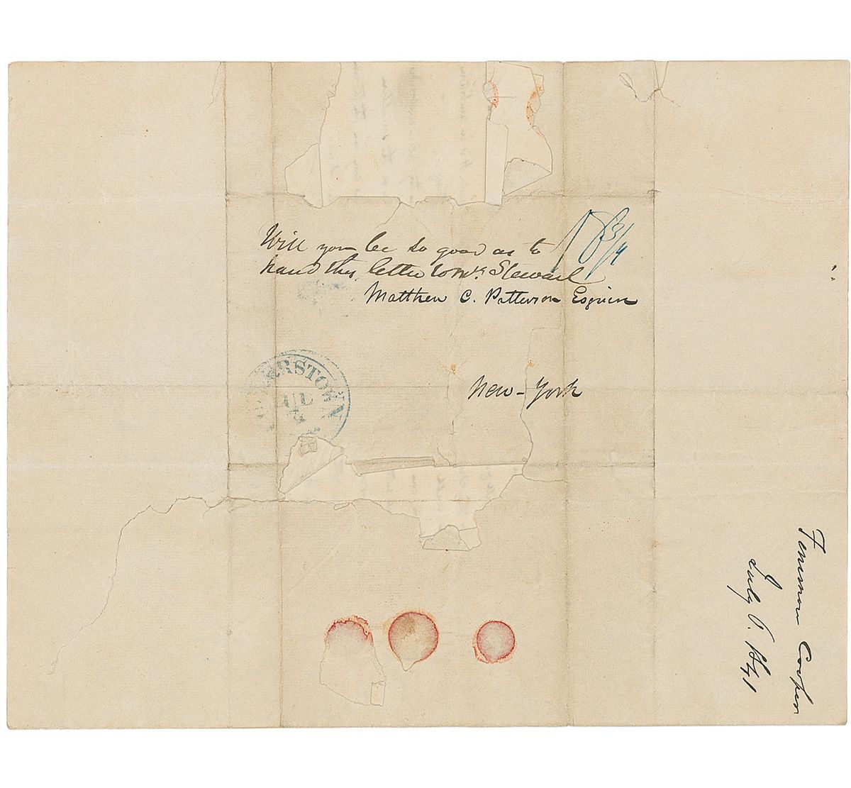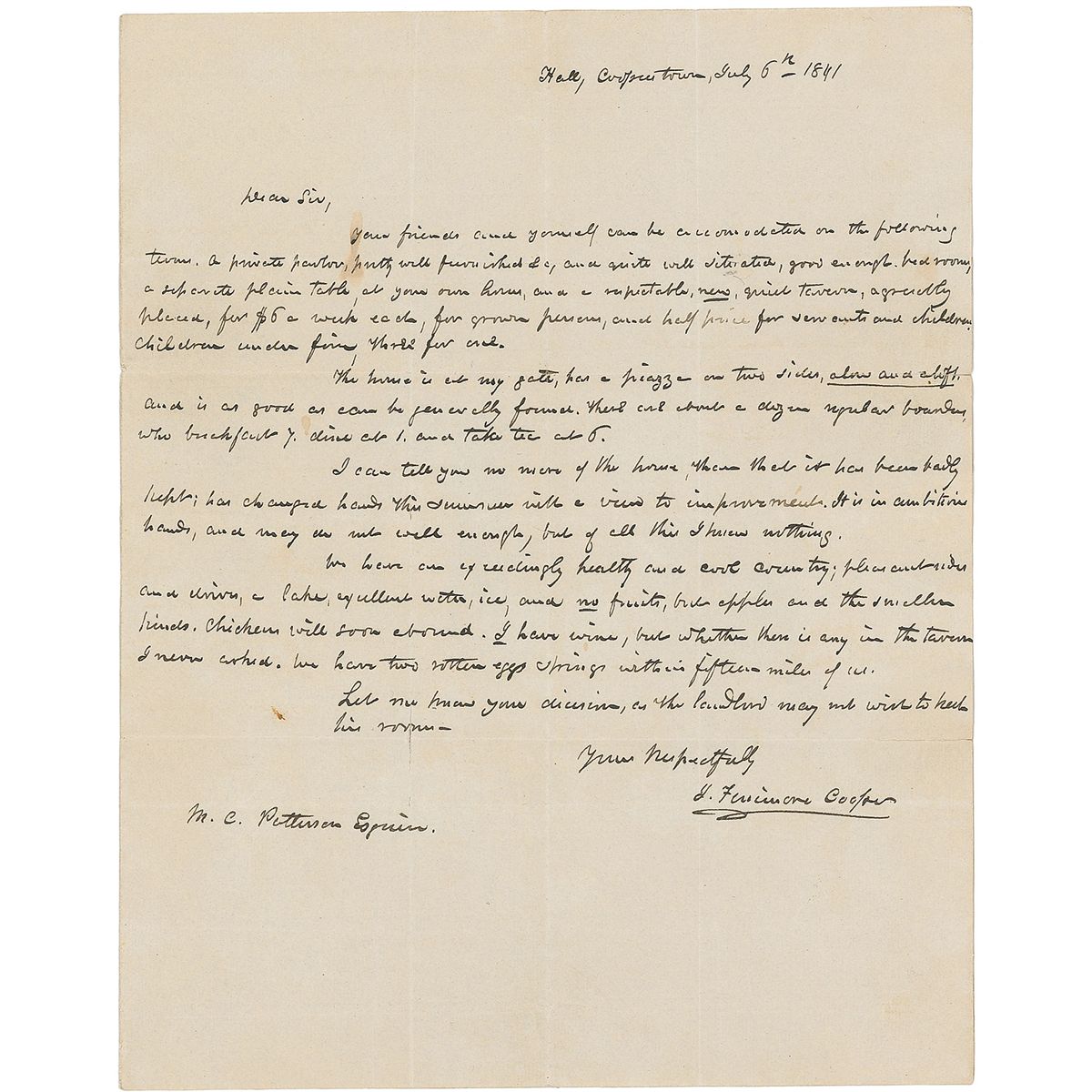 ALS signed “J. Fenimore Cooper,” one page, 8 x 10, July 6, 1841. Letter to M. C. Patterson. In part: “Your friends and yourself can be accommodated on the following terms. A private parlour, pretty well furnished & c, and quite well situated, good enough, bedroom…and a respectable, new, quiet tavern agreeably placed for $5 a week each…There are about a dozen regular boarders who breakfast at 7, dine at 1 and take tea at 5. I can tell you no more of the house.” Reverse of second integral page bears an address panel in Cooper’s hand, as well as a couple of docketing notations, presumably by the recipient In very good condition, with a few small separations along intersecting folds, a few spots of light toning, and paper loss to second integral page. Cooper had renovated the family manor located in Cooperstown in 1834 and owned it until his death. The same year as sending this letter, Cooper published his final Leatherstocking’s tale, The Deerslayer.