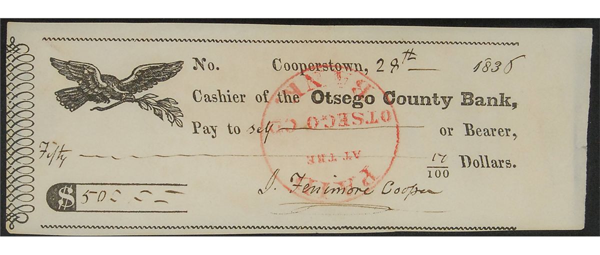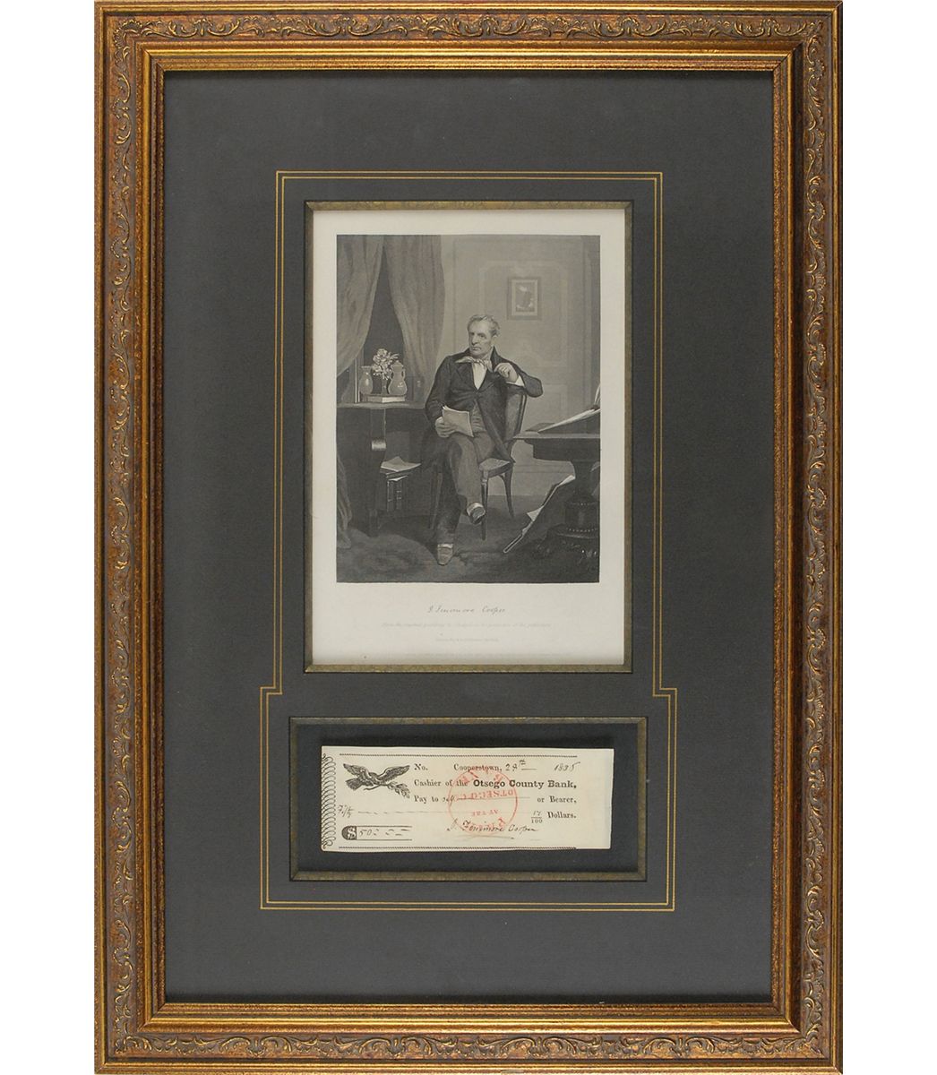 Bank check, 6 x 2, filled out and signed by Cooper, “J. Fenimore Cooper,” payable to self for $50.00, 1838. Matted and framed with an engraved portrait of Cooper to an overall size of 15.75 x 22. Irregular edges and a bank stamp to center over portion of signature, otherwise fine condition.