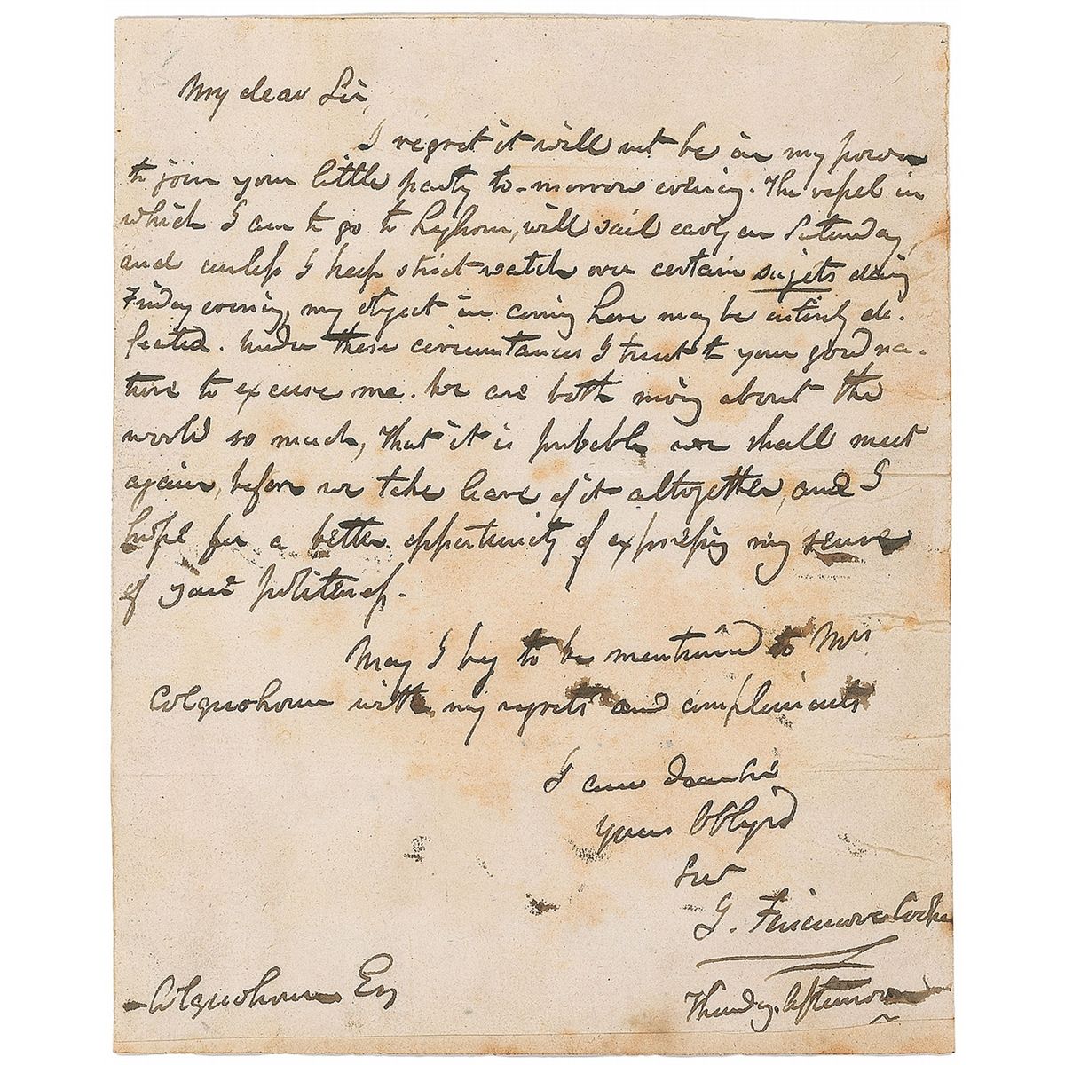 ALS signed “J. Fenimore Cooper,” one page, 4 x 5, no date. Letter to a gentleman. In part: “I regret it will not be in my power to join your little party tomorrow evening. The vessel in which I am to go to Lyhorn, will sail early on Saturday and unless I keep watch over certain subjects during Friday evening my object in coming here may be entirely defeated…We are both moving about the world so much, that it is probable we shall meet again.” Affixed to a heavier scrapbook page. In very good condition, with scattered stains and closely trimmed edges. Cooper’s writing proved controversial for his stridently expressed political views, and made many enemies while living in Europe due to his defense of his native United States. Letters by Cooper are rather uncommon.